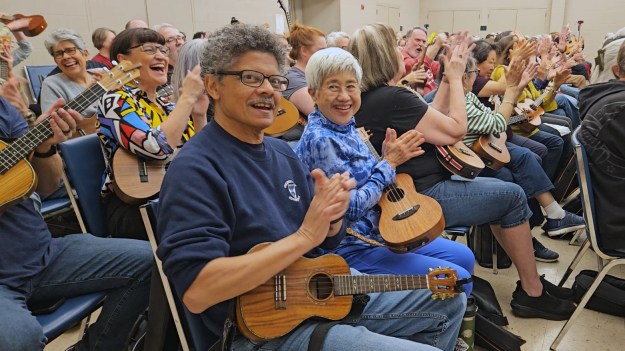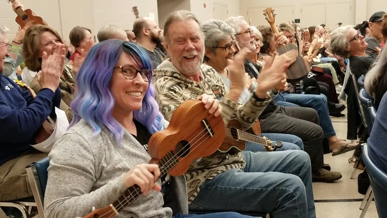 For the monthly meetings, our friend Lori brings loaner ukuleles, donated by the TUG (Tuesday Ukulele Group)! They are Makala concert and soprano ukes, and you can borrow one to play during the meeting. You’ll find them at the front of the room; so if you don’t have a uke yet, or you forget your uke at home, or your uke is in disrepair, please join us and borrow a TUG loaner uke. 🙂