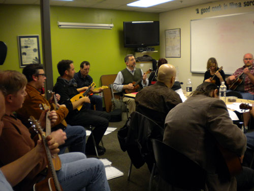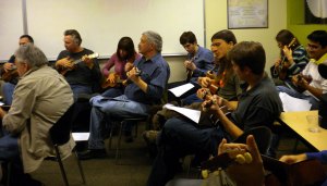 AUS appears to be establishing itself; we’re not just a one-meeting wonder any more. For the second month in a row, over 20 people have gathered to celebrate the ukulele. (Here are a couple of pix to prove we’re not hot-dogging you. Thanks, Jen, for the pictures.)