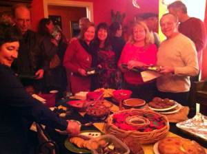 s past Thursday, Dec 8. Around 35 people attended, and everyone ate, drank, strummed, sang, and had a wonderful evening. Among the greatest of the treats (and there were many, as you can see), was Harry’s terrific haupia–Hawaiian coconut pudding served on a piece of palm leaf and garnished with pomegranate seeds (no, one di