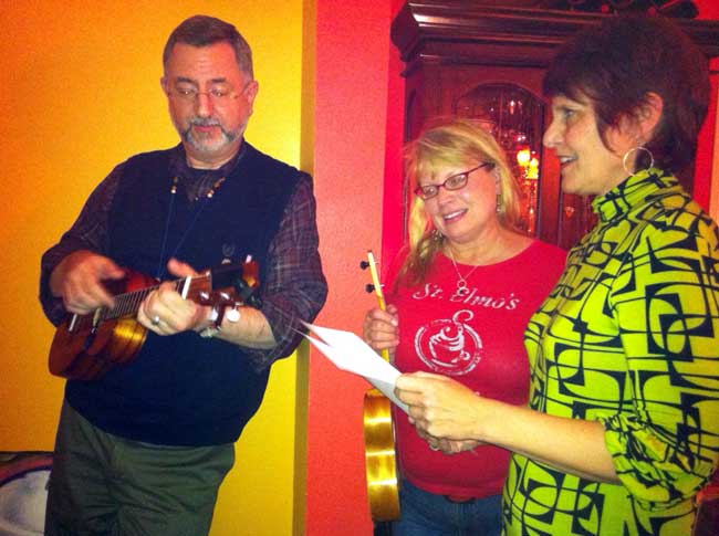 We sang lots of holiday songs — notably “You’re a Mean One, Mr. Grinch” — along with our previously featured “Blue Christmas” and “Rockin’ Around the Christmas Tree.”Several of us also shared non-holiday songs, too, such as the 20s Ukulele Ike hit “You’re My Weakness Now.”