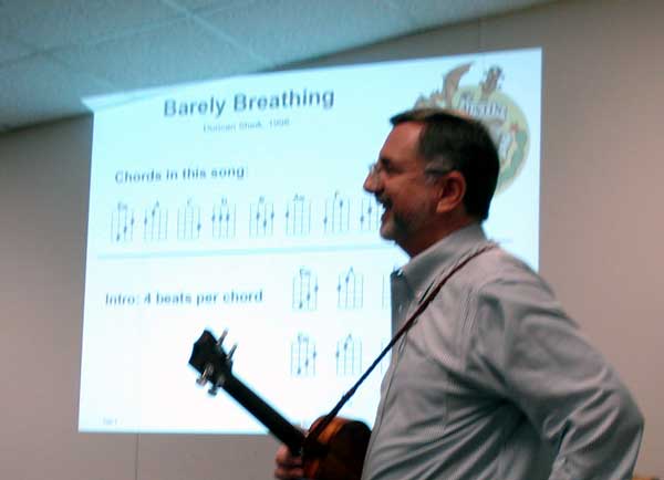 At our January 10 meeting, Bob taught the group how to play and sing “Barely Breathing,” a really big hit for Duncan Sheik in 1997–although when Bob asked the group whether they knew the song, many people did not raise their hands. Selecting the song was part of AUS’s effort not to always sing pre-1980 songs–we want to find good ones from the last thirtyaus1131 years, too. We had a good time with “Barely Breathing” anyway–it wasn’t a difficult song to catch on to. Here’s Bob’s Barely Breathing – Presentation Format to see what he shared.