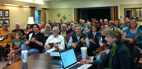 It’s a little scary for some of us who want to perform in public to face the idea of playing our numbers without a chart of chords to follow (at least it is for me). I know that I’ve got to memorize the chords and lyrics for all eight of the songs we’re doing at the two performances. That’s why we have the Ukulele Music Library, of course. We can read the charts from our screens or print ’em out on paper. Either way, it helps us play them over and over until we have them down pat. (If you’re interested in joining us on either or both days, drop a line to austinukes[at]gmail.com.)