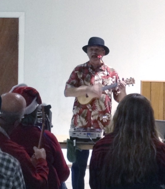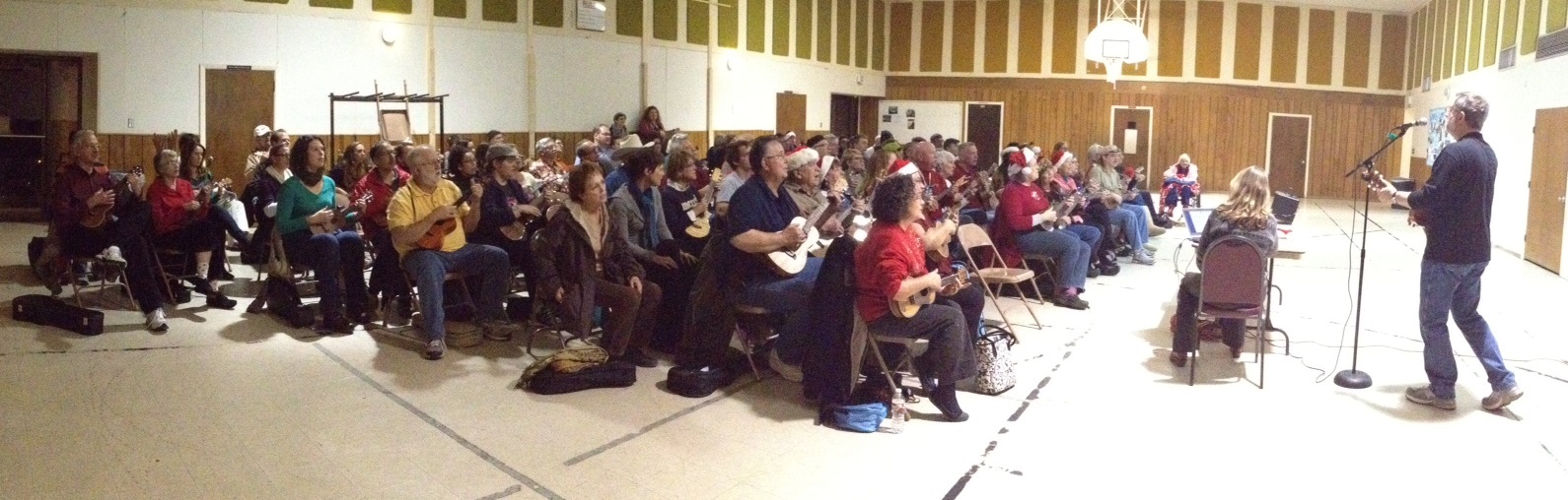 Our November meeting was on the coldest night Austin has seen since February, which was the perfect setting to get the holiday spirit going with our Rockin Christmas Medley! At our largest gathering yet with over 100 ukulele players, we not only sounded great but looked festive, too, with Santa hats, reindeer antlers, and Christmas sweaters. We may not have been dancing and prancing in Jingle Bell Square, but we were strumming and singing in the frosty air. π