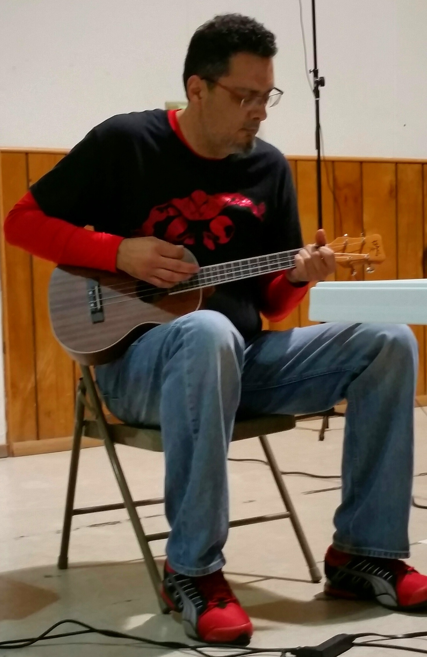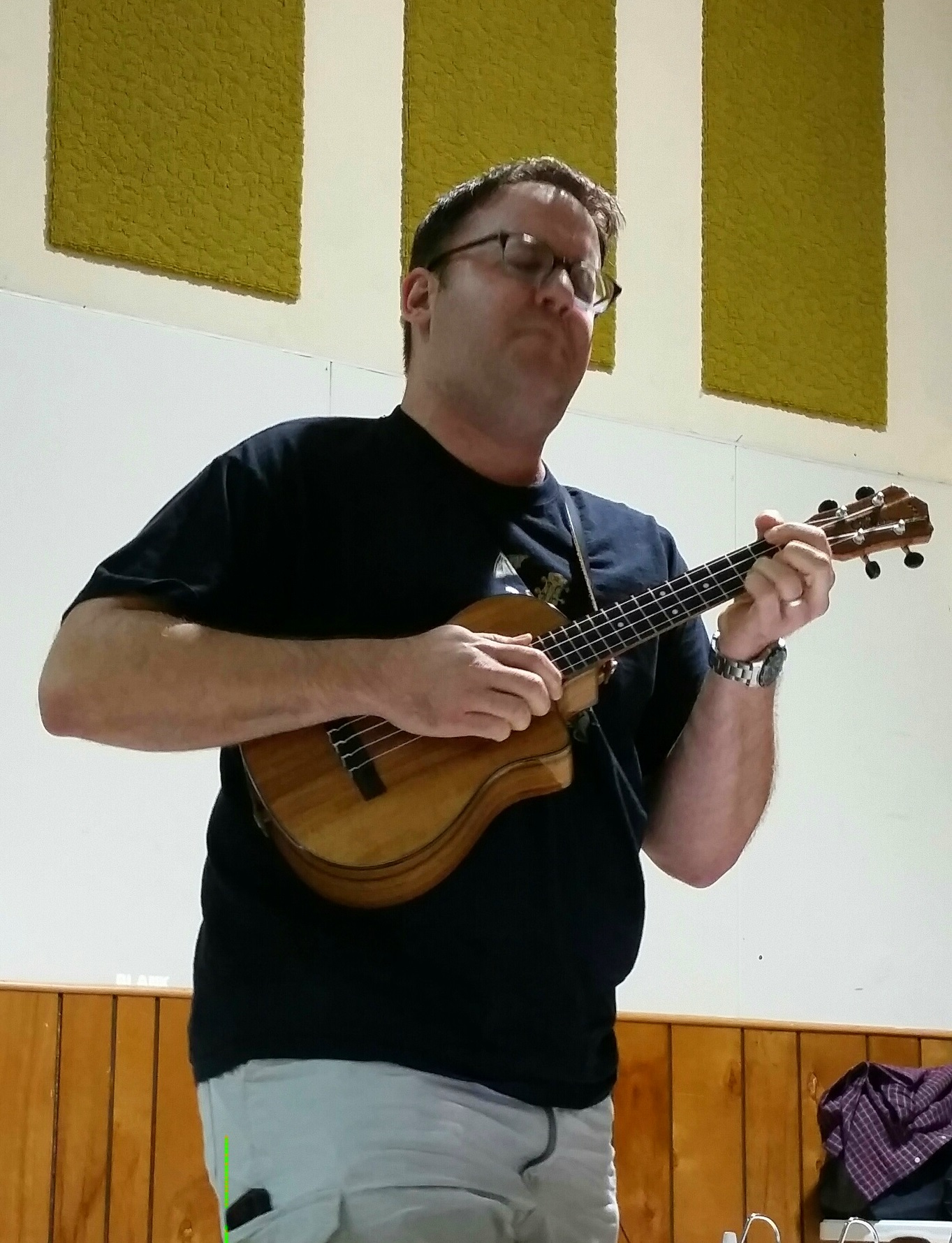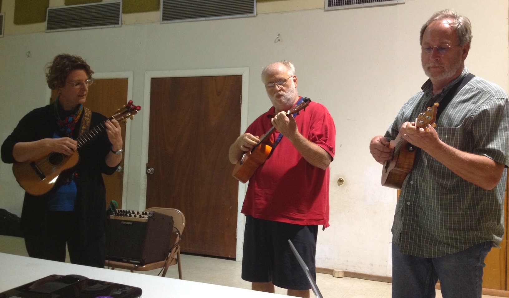 With first-timers from as far as Oklahoma and Austin Ukulele Society veterans alike, the 90 or so May meeting attendees enjoyed an energetic and fun-filled evening. We learned and played Bruce Springsteen’s mega-hit from the 80’s, “Dancing in the Dark.” Bob broke down the chord progressions, making it easier for us to put the song together and sound great playing it after just a few run-throughs. The Boss himself would be proud.