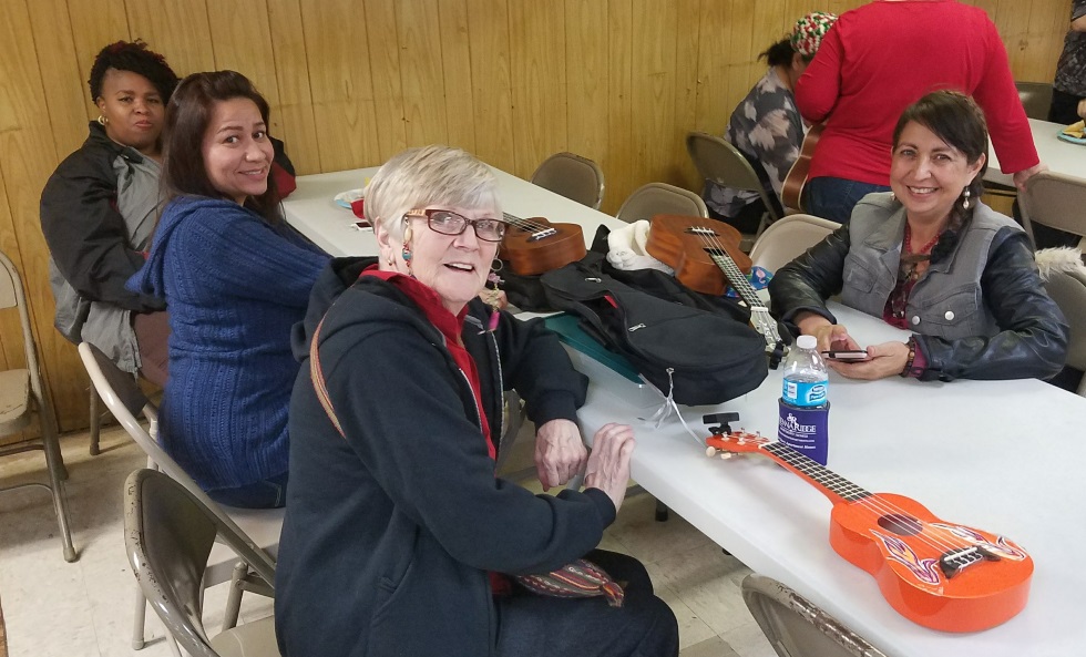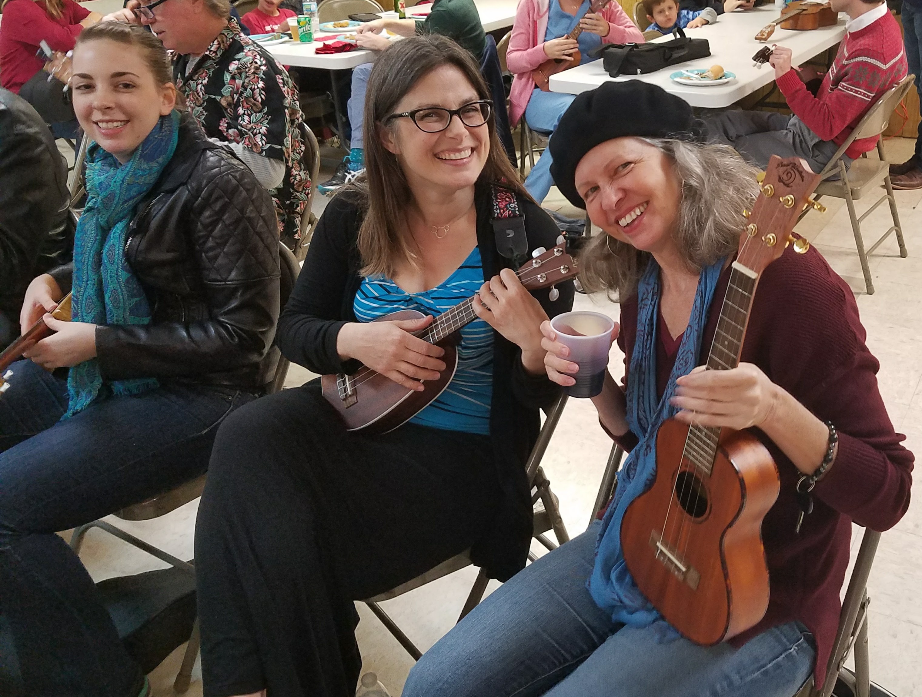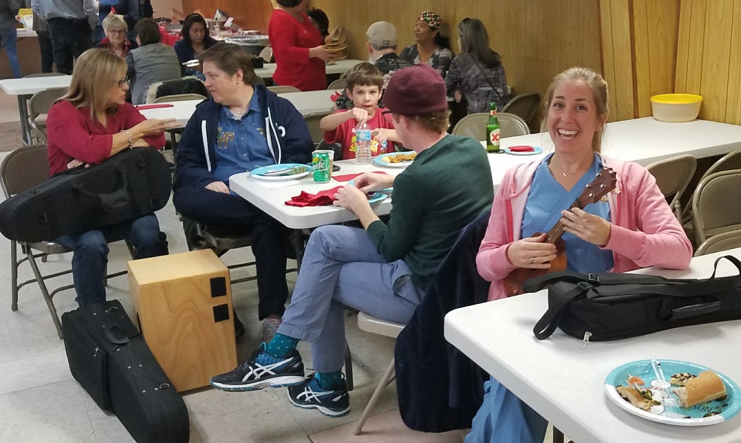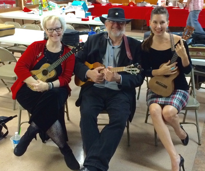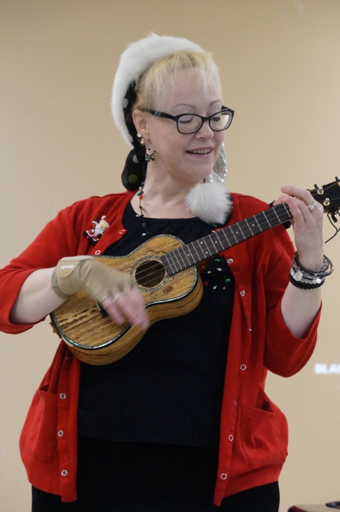 A cheery group of Austin Ukulele Society members got together a week earlier than we usually do at the Austin Moose Lodge for our 6th Annual Holiday Potluck and Jam, as we just couldn’t wait to toast the season and sing and play some great Christmas songs together on the ukulele. During the first hour or so, we enjoyed mingling and consuming some delicious bites and beverages together. We then sat down to play all of the Christmas songs we have learned together over the past six holiday seasons – it was a wonderful way to get the holiday spirit going! Of course our tunes included the latest addition to our holiday repertoire: a medley of “Holly Jolly Christmas and Marshmallow World“: