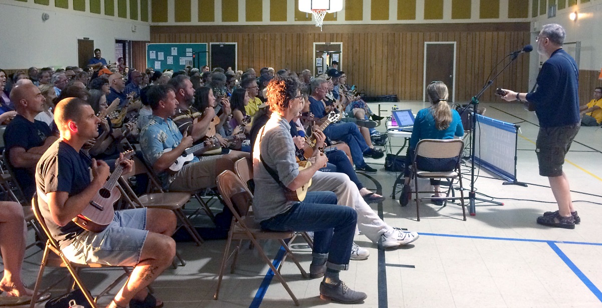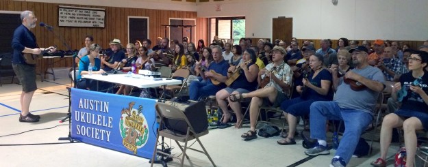 Possibly the largest group of ukulele players to ever attend an Austin Ukulele Society monthly meeting got together to conjure our 1980’s spirit on a sultry August evening. August 2017 marks the AUS’ 80th monthly meeting, and with the love for 1980s music alive and well across many generations, it seemed a great opportunity to learn an iconic ’80s song: Madonna’s “Material Girl.” After sharing some local ukulele news, Bob led the group through exercises to build our comfort level with the various parts of the song. There were opportunities to pick, strum, harmonize and more. With each run-through, the group got stronger at the chord transitions and more confident with the vocals. We were sounding great by the time we took a break to hear some amazing open mic performances. After the open mic portion, the group joined together again to play “Material Girl” a few more times and record it for our YouTube friends around the globe. Check out our skills by the end of the meeting: