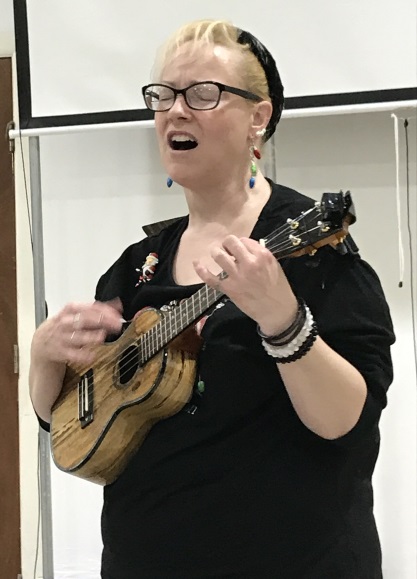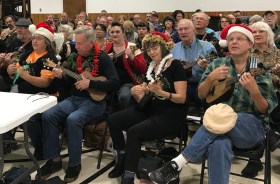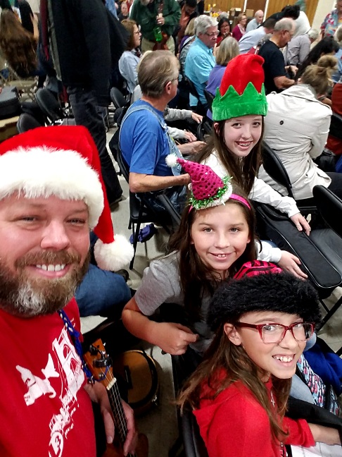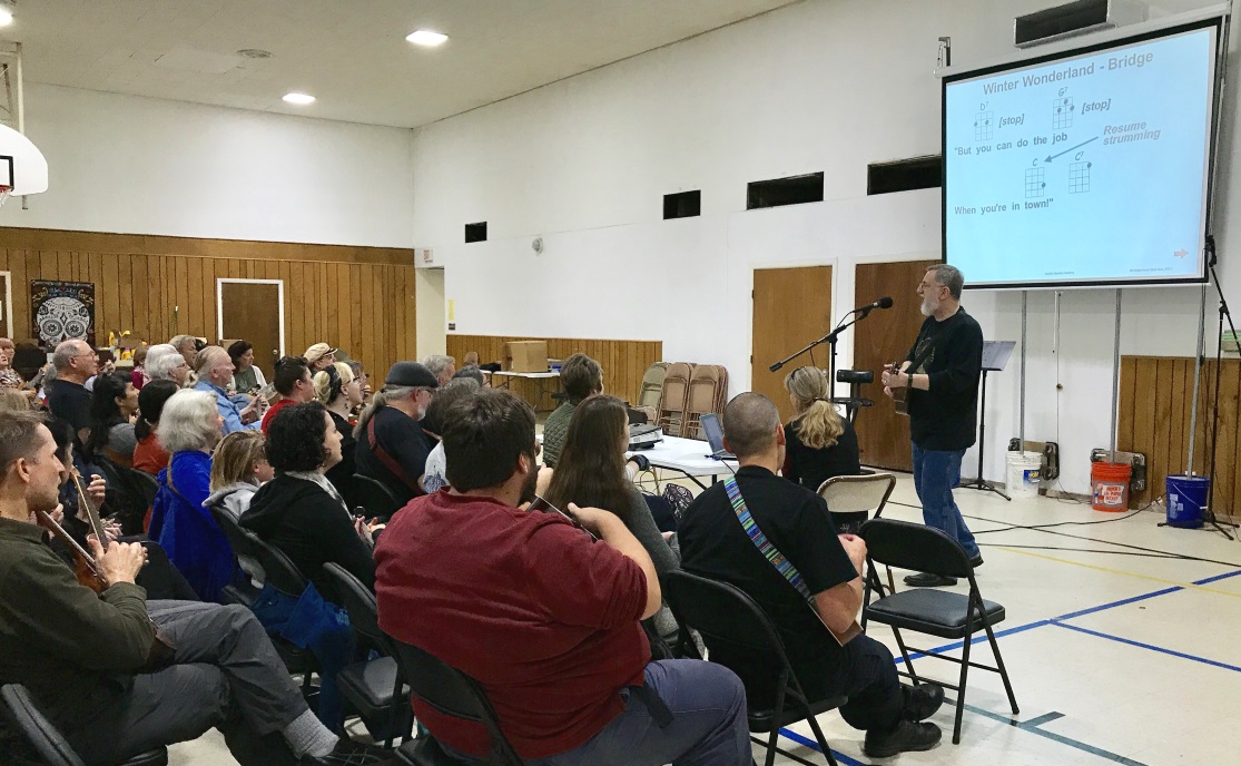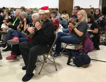 On a chilly and gray November evening, the Austin Ukulele Society created warmth and cheer for all. The meeting kicked off with introductions, info about upcoming local ukulele events and our warm up song, “Three Little Birds.” Next, Bob introduced our holiday medley of “Let It Snow” and “Winter Wonderland” and walked the group through helpful chord progression exercises, which made it easier to play. After rehearsing the medley a few times, we took a break and practiced one of our favorite songs and most popular videos on YouTube, “Wagon Wheel.” We hope you enjoy our recent take on it, a little more than four years since we first recorded it. Afterward, we spent more time with our holiday medley and recorded it to share in December. We are grateful to those of you who displayed your holiday spirit with Santa hats, Christmas sweaters and jewelry, and more, to make our meeting and video even more festive!