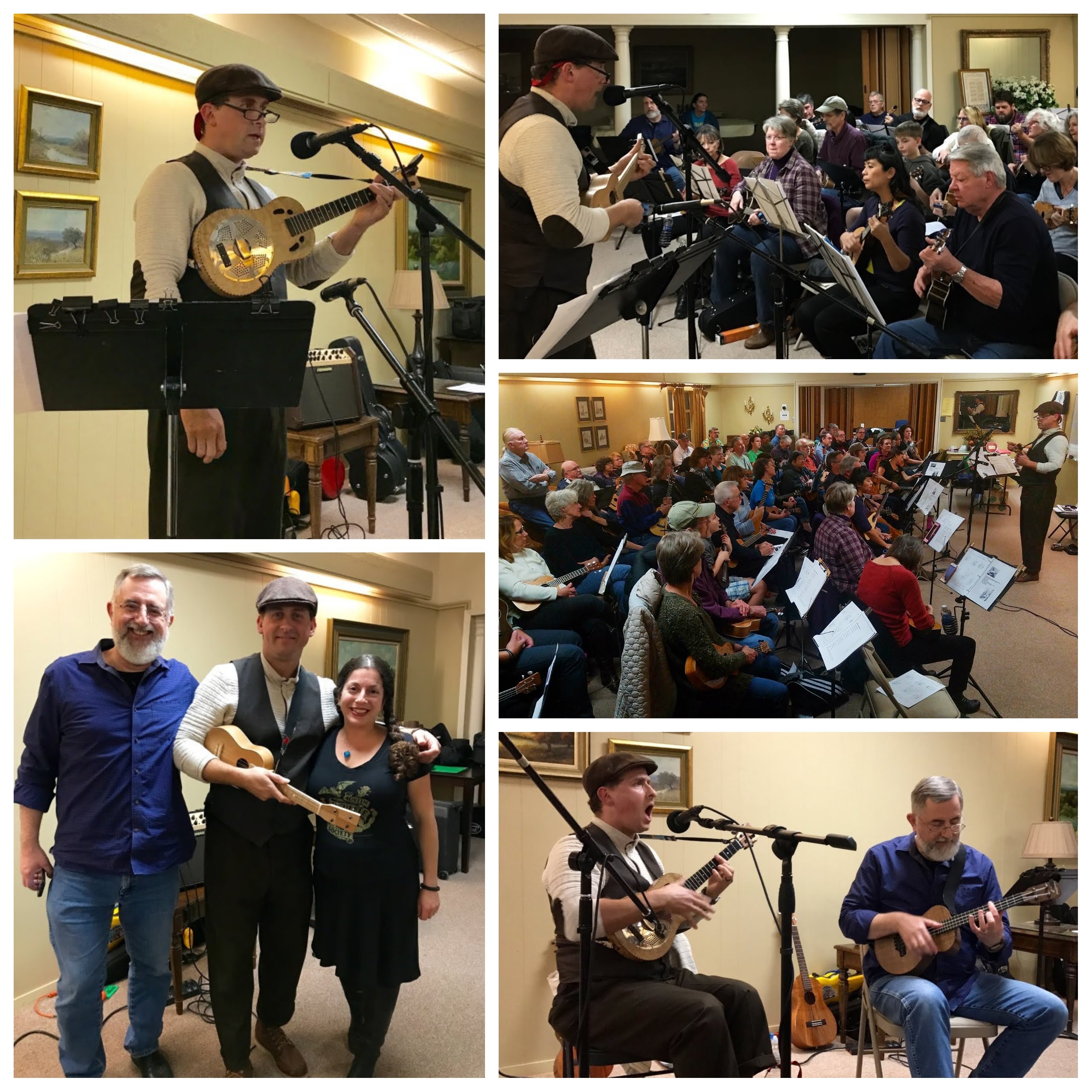 The very next night, we were thrilled to welcome Lil Rev, a preeminent ukulele instructor and performer who hails from Milwaukee, back to Austin for the first time in five years. Rev presented a fantastic workshop inspired by his love for Lead Belly, teaching the group ways to add blues and boogie elements to their strumming, as well how to play several of Leadbelly’s most influential songs. Shortly after the workshop, Rev enchanted the full house of over 60 attendees with his exceptional storytelling and an excellent concert performed on both ukulele and harmonica. The group was thrilled to see their own Bob Guz perform a couple of tunes with Rev. After an excellent encore, we regaled Rev with a standing ovation; everyone looks forward to having Rev back in Austin in the not too distant future.
