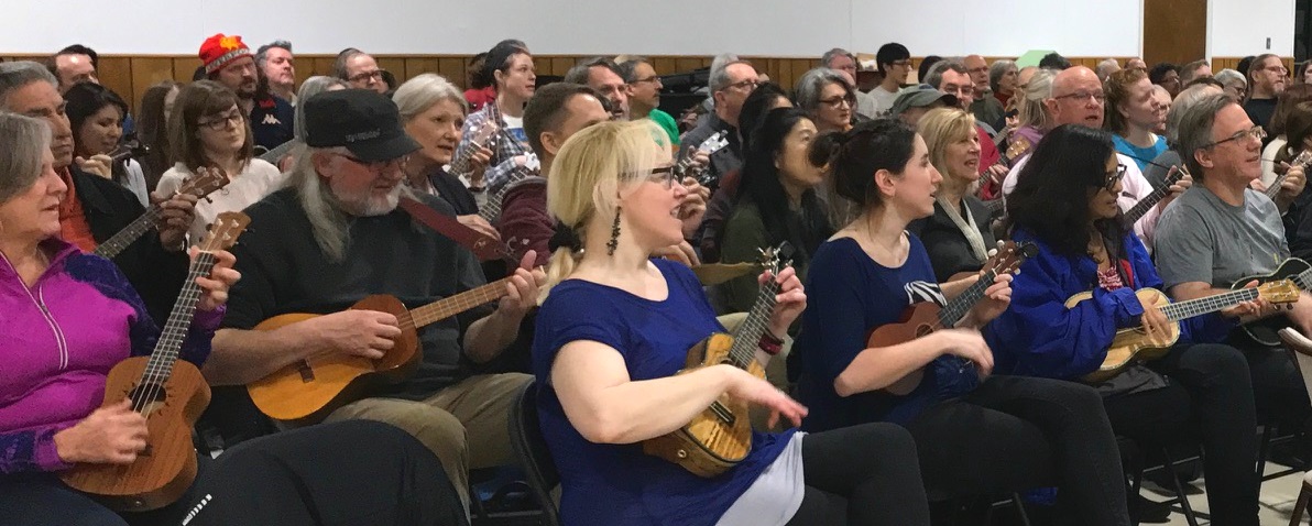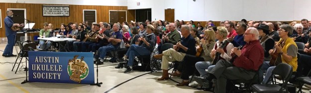 At the February meeting of the Austin Ukulele Society, over 140 ukulele players got together to lament love, strum, and harmonize on a couple of classic Hank Williams heartache tunes: “Your Cheatin’ Heart” and “Cold, Cold Heart”. It is, after all, our tradition to learn a Valentine’s Day song of love in February, and so we changed that up a bit since love sometimes hurts.