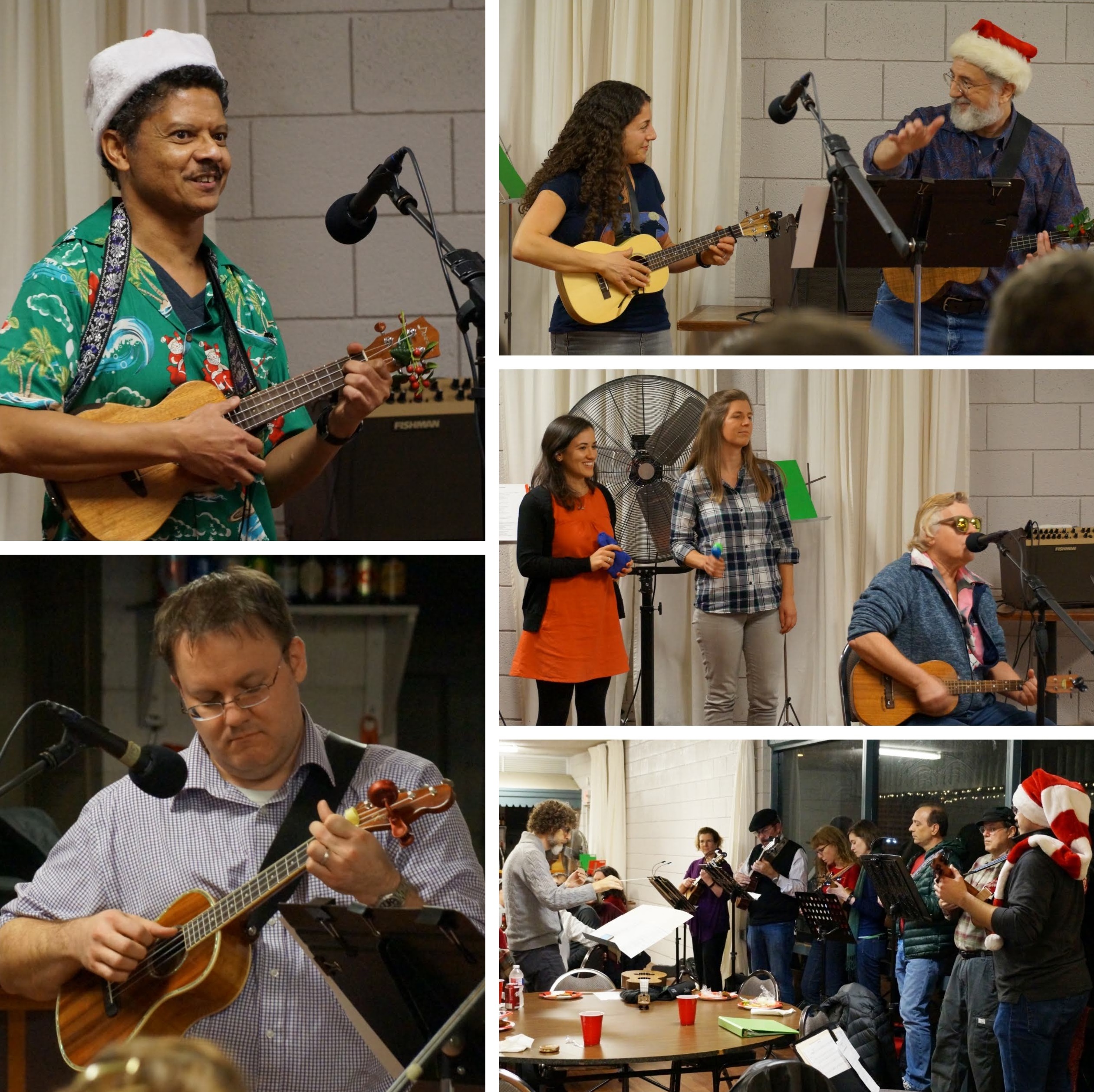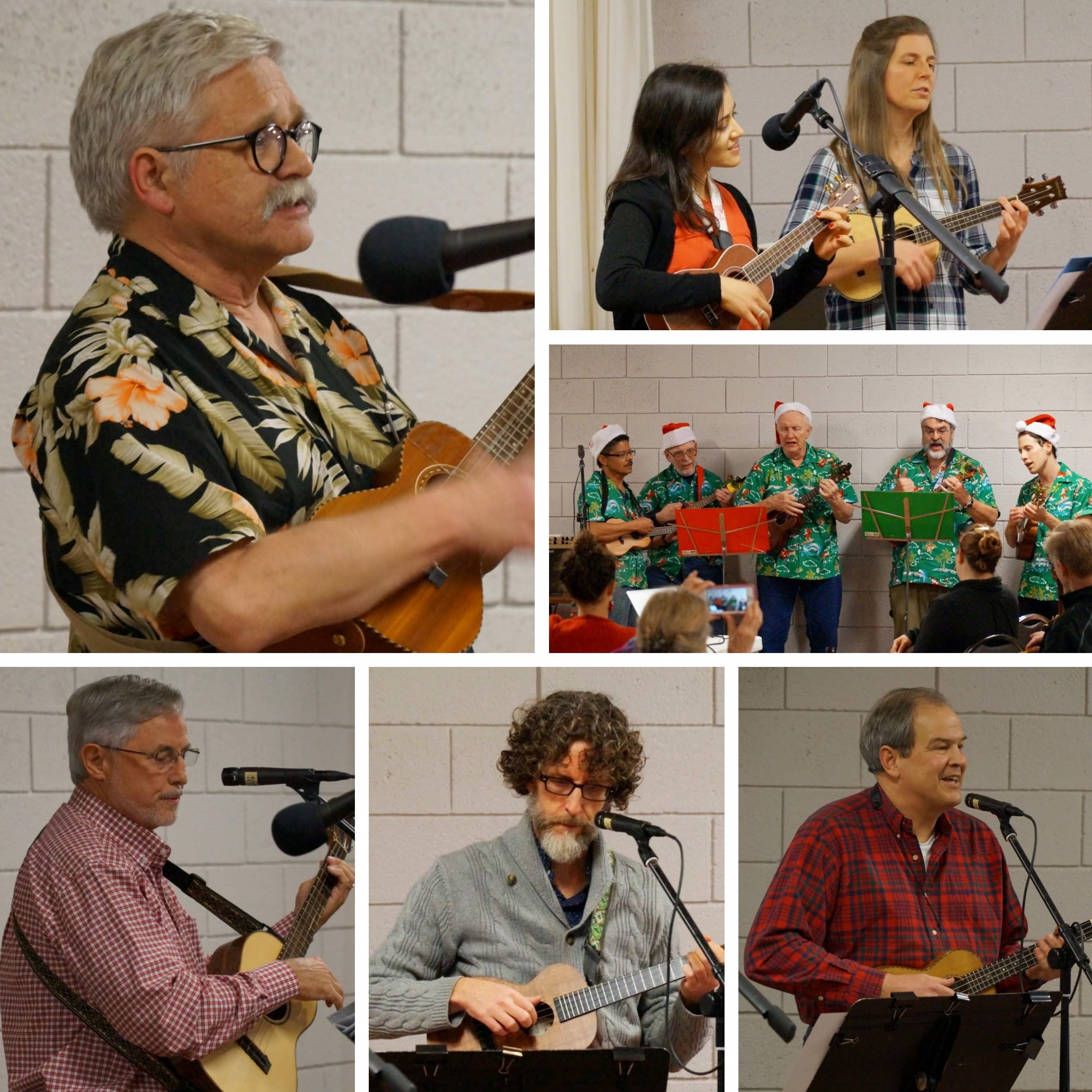Clockwise from top left: Walter, Erin and Gabrielle, the Tuesday Ukulele Group (TUG), Jay, Kevin, Ray