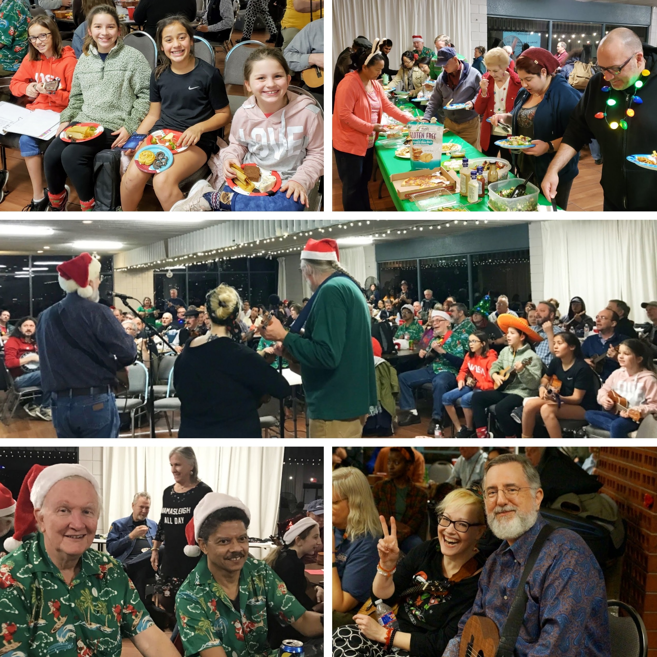 On a windy and chilly December evening, over one hundred Austin Ukulele Society members, friends, and family gathered for our eighth annual Holiday Potluck and Strum-a-long, at the High Road on Dawson. There was much merriment, as folks enjoyed socializing over food and drinks. We also got out our ukuleles and Bob (with assistance from The John Davenport and Helen) guided the group through a strum and sing-a-long of our holiday song repertoire. We are so grateful for the wonderful year we’ve had, making great music with our Austin-area ukulele friends. We’re wishing everyone peace, love, and joy through the holiday season!