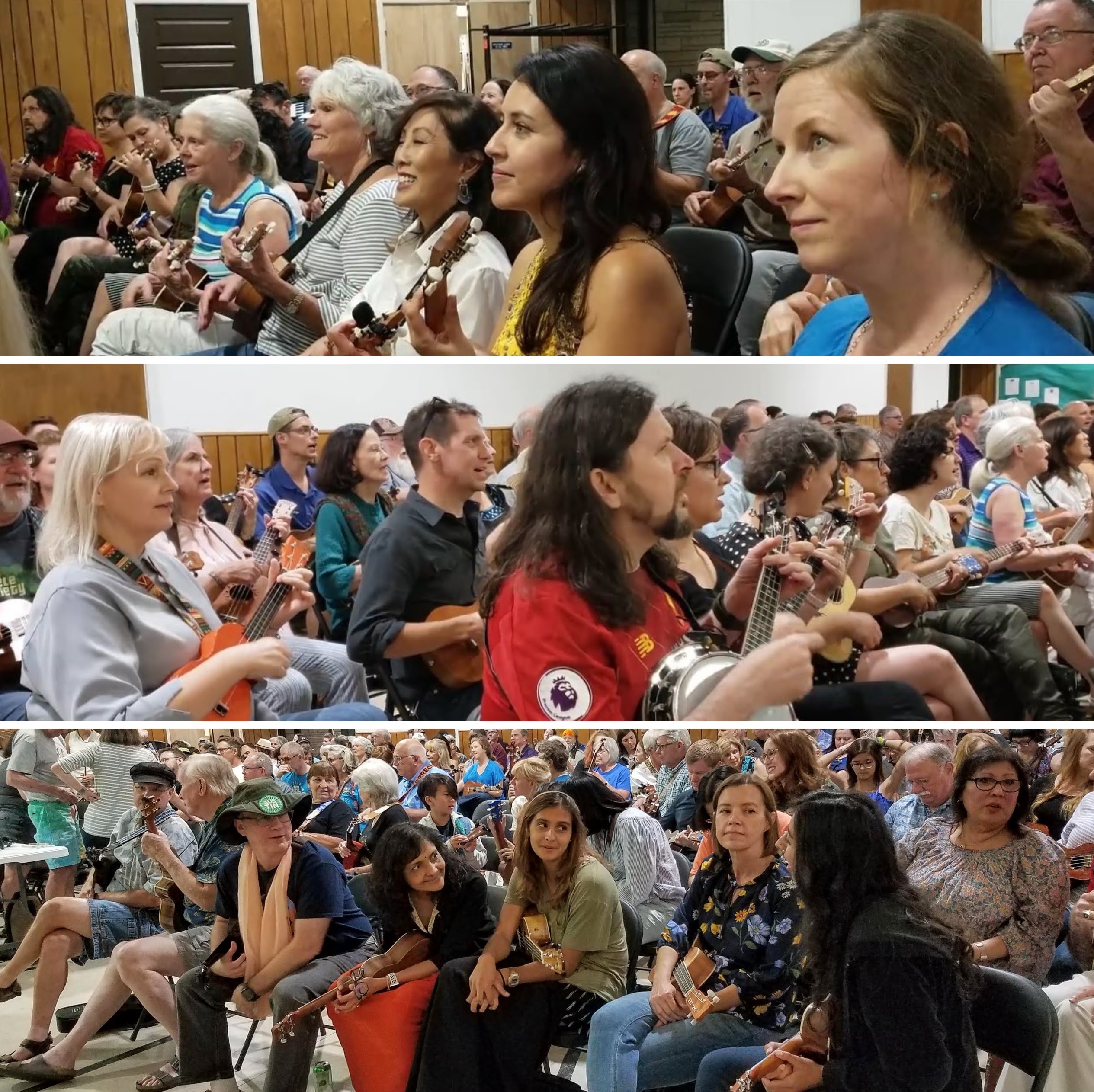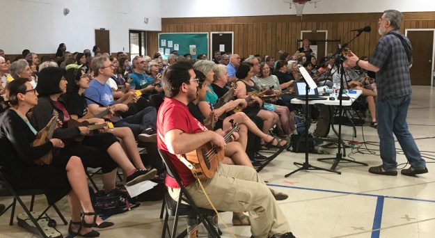 The Austin Ukulele Society was pleased to host its June meeting for a wonderful group of ukulele-playing friends from far and wide. Our summer meetings are especially fun, as we find teachers and students who are too busy during the school year making time for our favorite hobby – strumming that uke and singing along! We began our meeting with local ukulele news, including announcing a fundraising workshop and concert to be presented by Bob Guz on Friday, July 26, and a reminder about our upcoming ukulele open mic eve at Kick Butt Cafe on Saturday, August 17. Then we warmed up by playing Bob Marley’s always uplifting “Three Little Birds.”