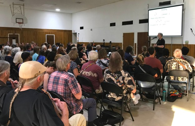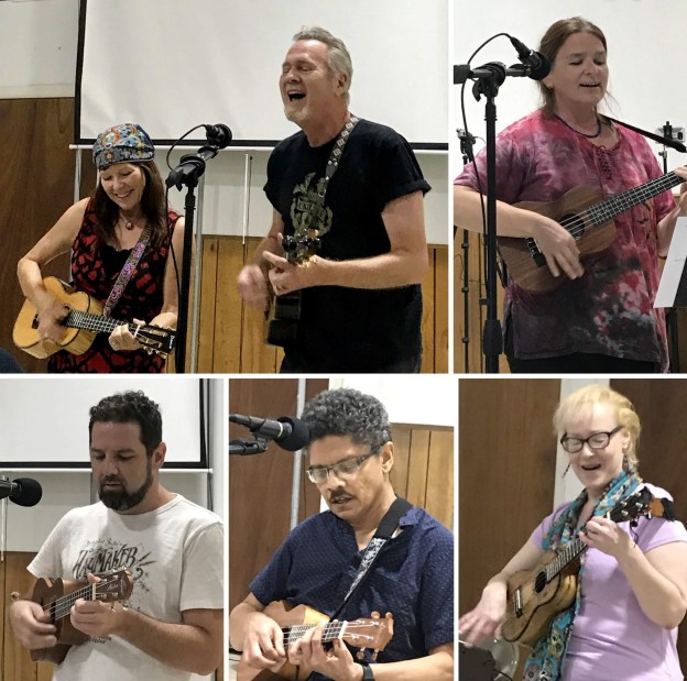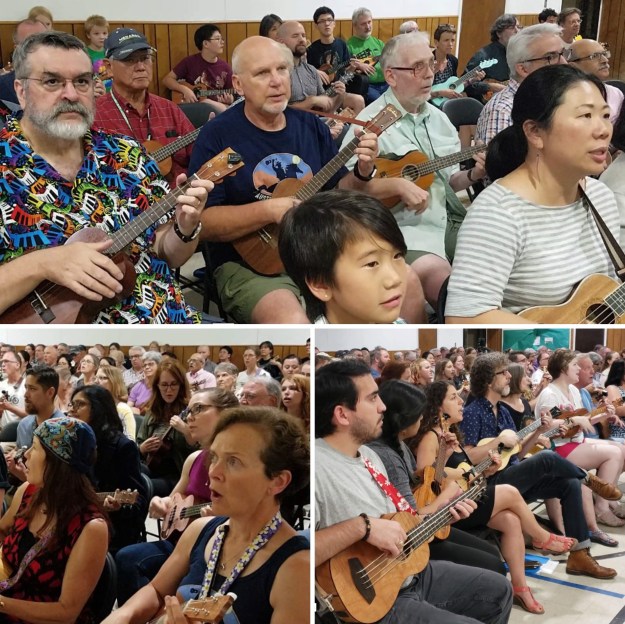 On a warm and muggy August evening, a group of 160+ ukulele enthusiasts joined to sing, strum, and learn together. The evening began with folks sharing local ukulele news and events, including a reminder about our upcoming ukulele open mic event at Kick Butt Cafe Saturday, August 17. We then quickly warmed up our voices and fingers with Bob Marley’s uplifting “Three Little Birds.”