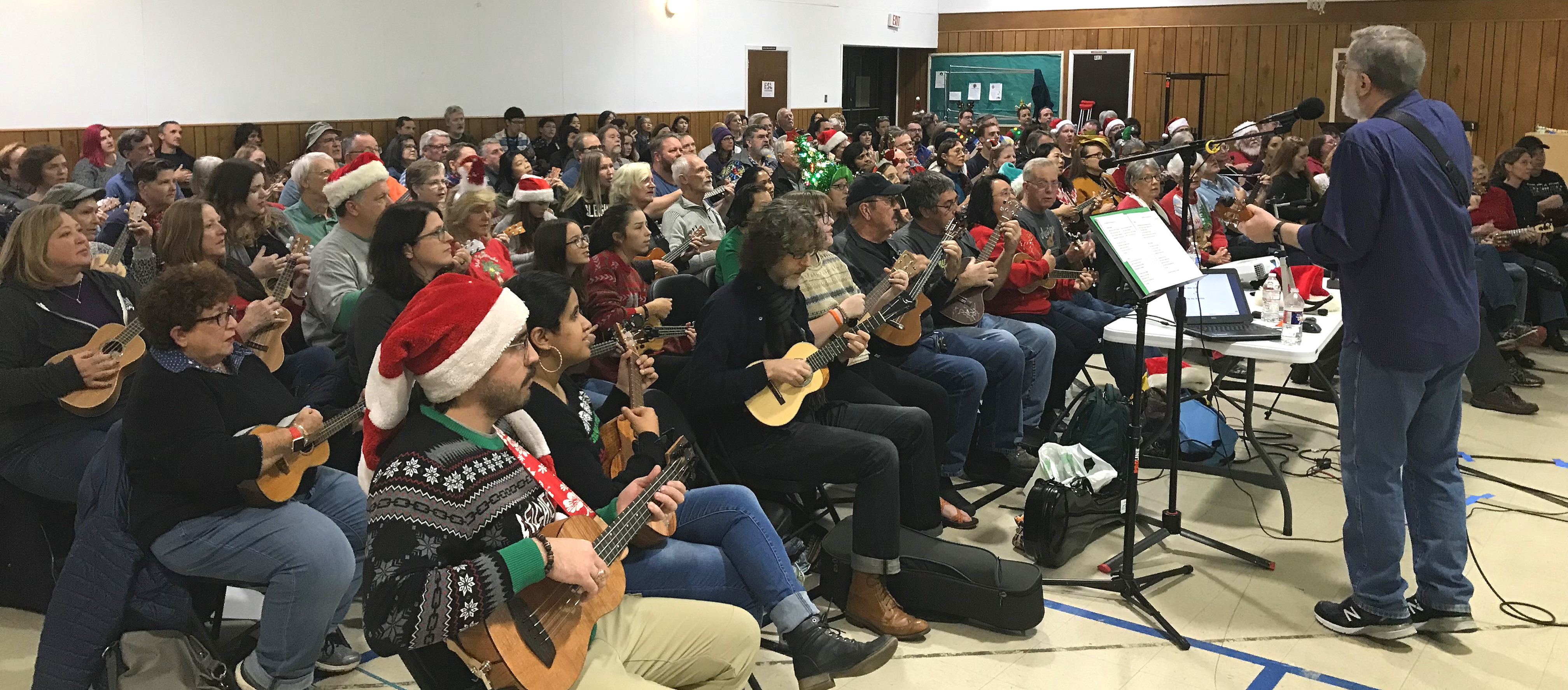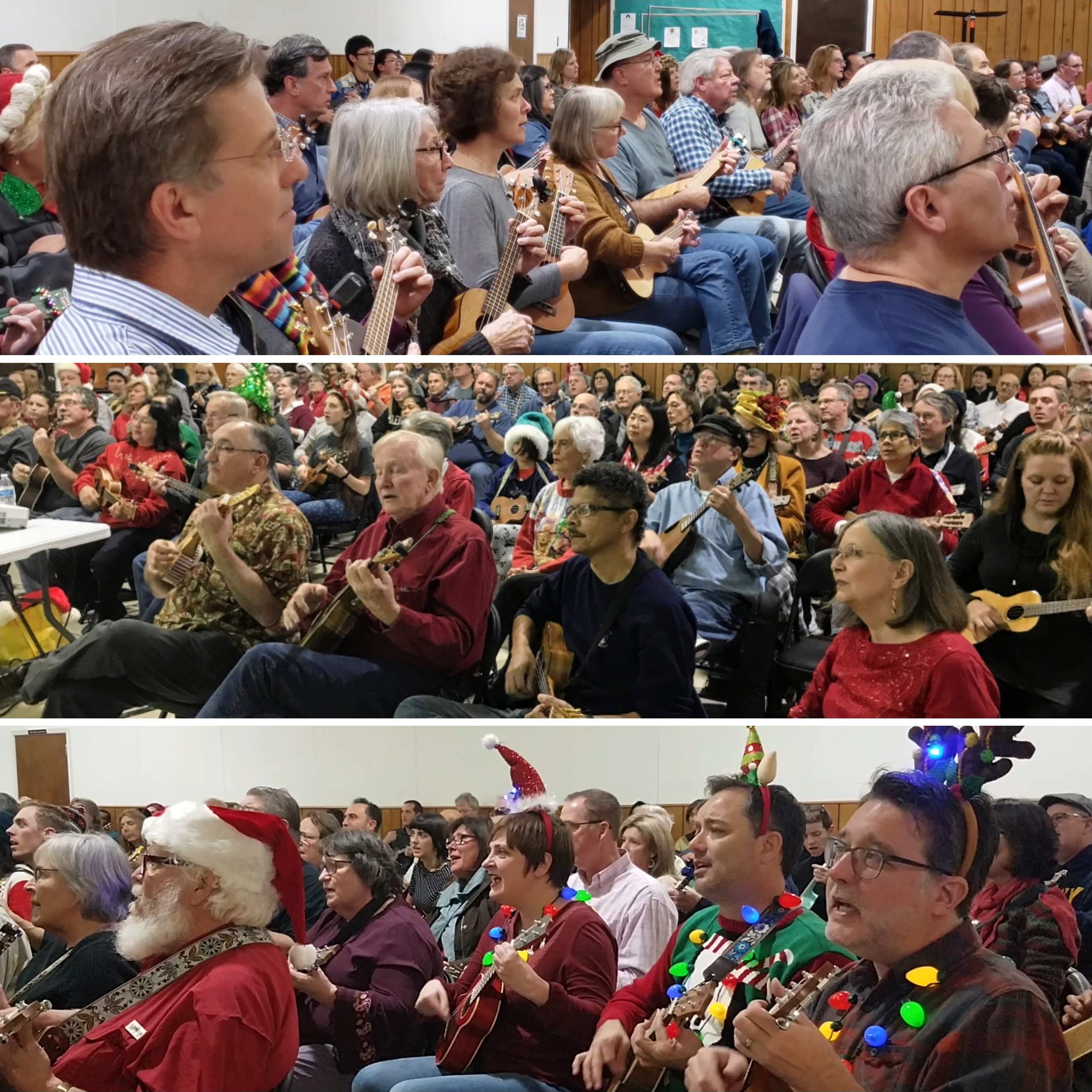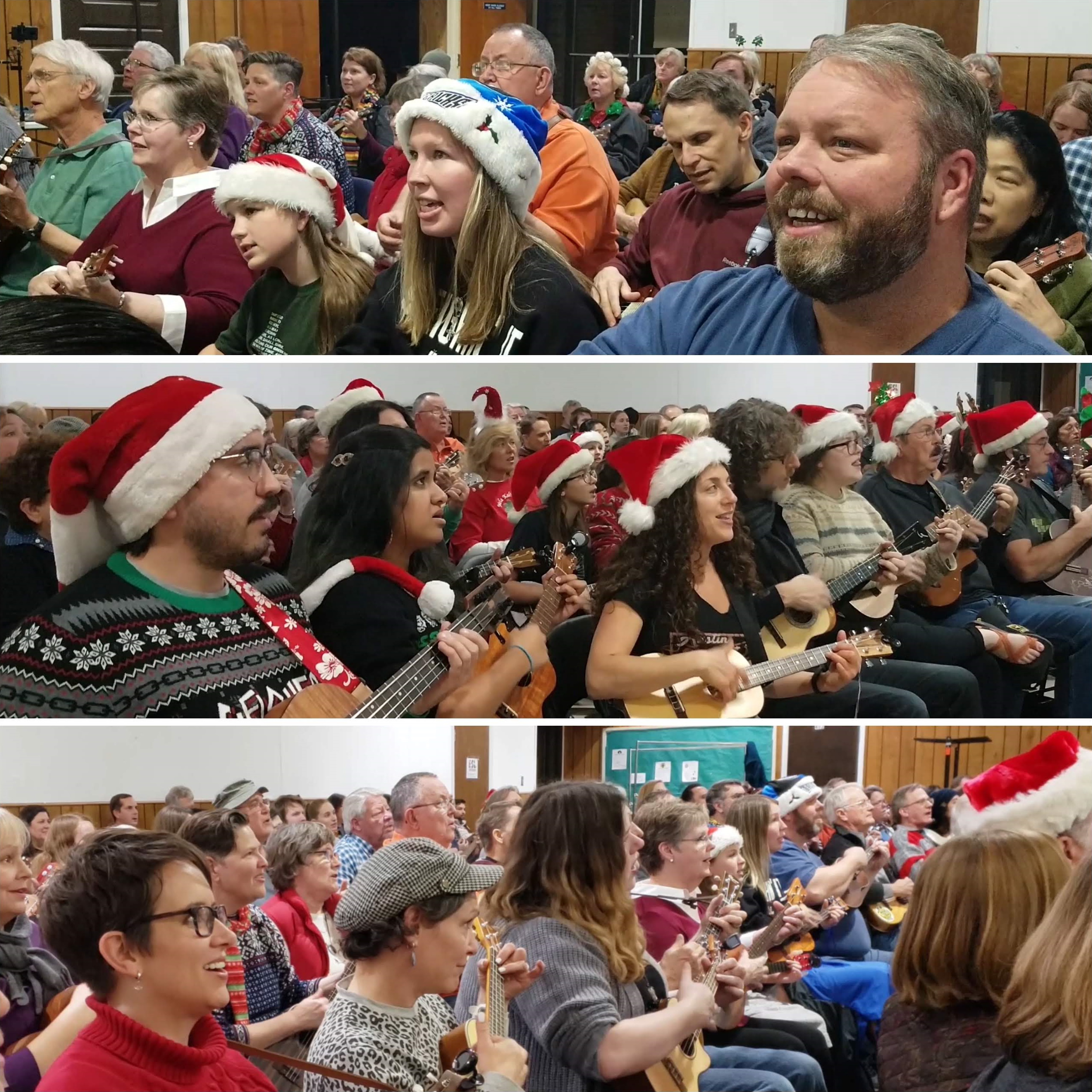 On a chilly November evening, around 150 members of the Austin Ukulele Society created plenty of warmth and cheer as they gathered to sing and play ukulele together. After sharing some local ukulele news, introducing ourselves and welcoming visitors, we played Bob Marley’s “Three Little Birds,” as we always do, to kick off our musical time together. As is our habit at our November monthly meeting, we learned to sing and strum a holiday favorite together. This year, we enjoyed paying tribute to Mariah Carey’s modern-day classic, “All I Want For Christmas Is You.”