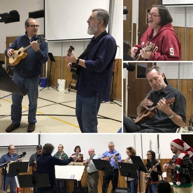 First, Bob demonstrated his arrangement for us by performing it. Then he led the group through some very helpful exercises, to get us comfortable with the strum pattern, chord progressions, picking options, and vocal harmonies. We sounded better and better as we played each part and then the song in its entirety. We are grateful to Aaron Lewis on U-bass for helping us keep the rhythm. We hope our performance gets you in the holiday spirit — check it out: