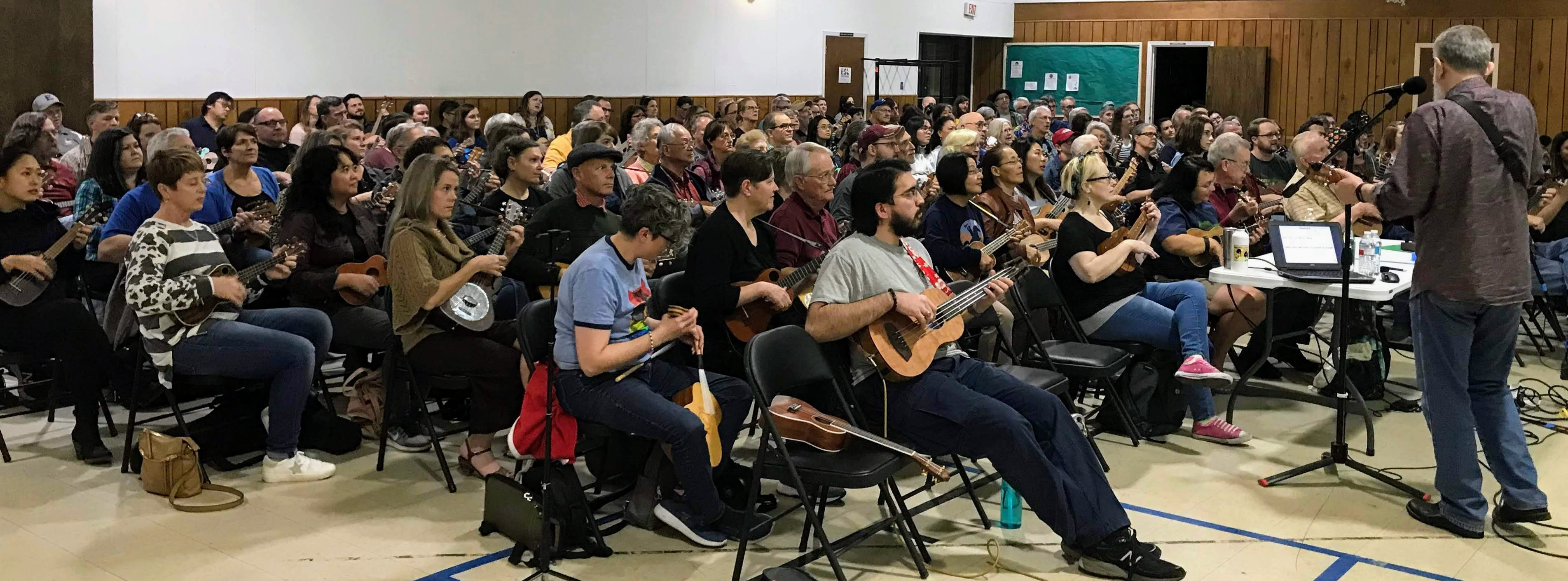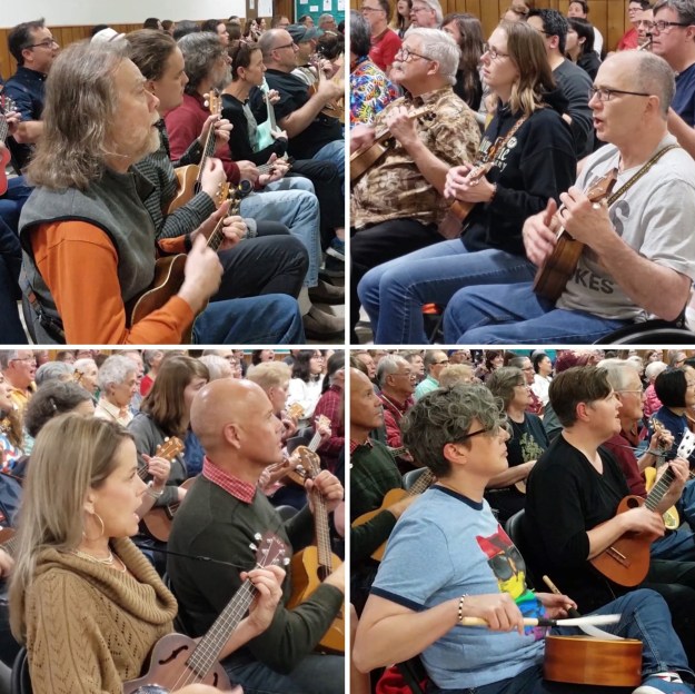 On January 9 over 150 ukulele players joined together to kick off the 10th year of monthly Austin Ukulele Society meetings in terrific style! We had a wonderful time, with a few friends who’d been present at our very first meeting in January 2011, as well as many friends we’ve come to know over the years, plus first-timers and visitors from afar. We thank you, as always, for your warmth and enthusiasm, your strumming and your singing, and affection for our favorite 4-string instrument.