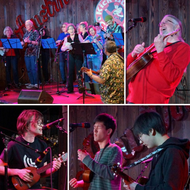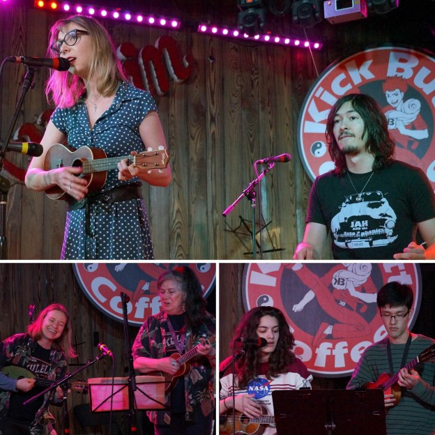 We hosted another fabulous and fun Open Mic Happy Hour Saturday, February 22, at Kick Butt Coffee. We had more performers than at any of our previous open mic events! Ukulele-loving folks packed the place while over 80 musicians performed in groups, duets, and as soloists for the large, supportive, and joyous crowd. An incredible line-up of fantastic talent! A wonderful evening of friends and ukulele music! Thanks to everyone who came out to enjoy the music, all who performed, Lyda Guz for the fantastic photos, Bob Guz who acted as MC, and Jen Richardson for all her work in organizing the event!