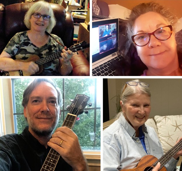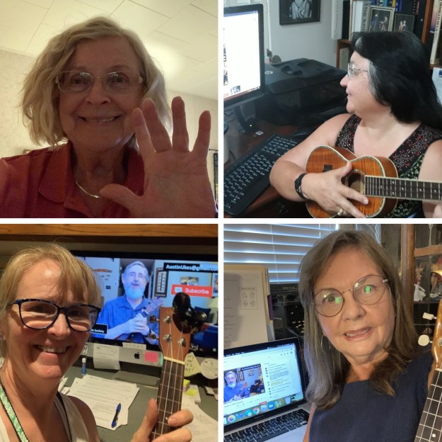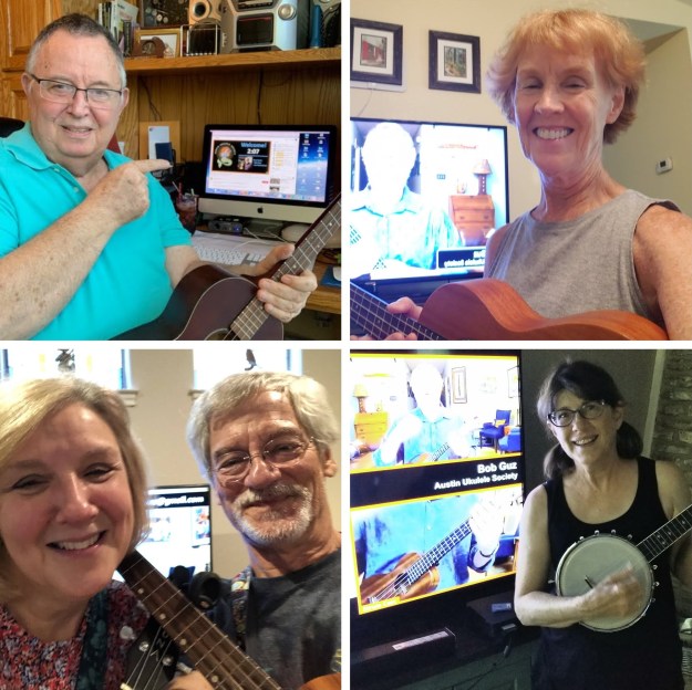 On a mid-August evening, nearly 200 ukulele players on at least four continents (North America, South America, Europe and Australia) met up virtually to play music and sing songs, in pandemic-style togetherness, keeping the ukulele kindred spirit going strong. As the Austin Ukulele Society’s virtual meeting got started, everyone had a great time catching up over the live chat and seeing a cool photo of Bob’s grandpa playing ukulele in 1930. Bob then shared some local ukulele news, including a recap of our recent fundraiser for Kick Butt Coffee, and we launched into our warm up song (Bob Marley’s “Three Little Birds.”)