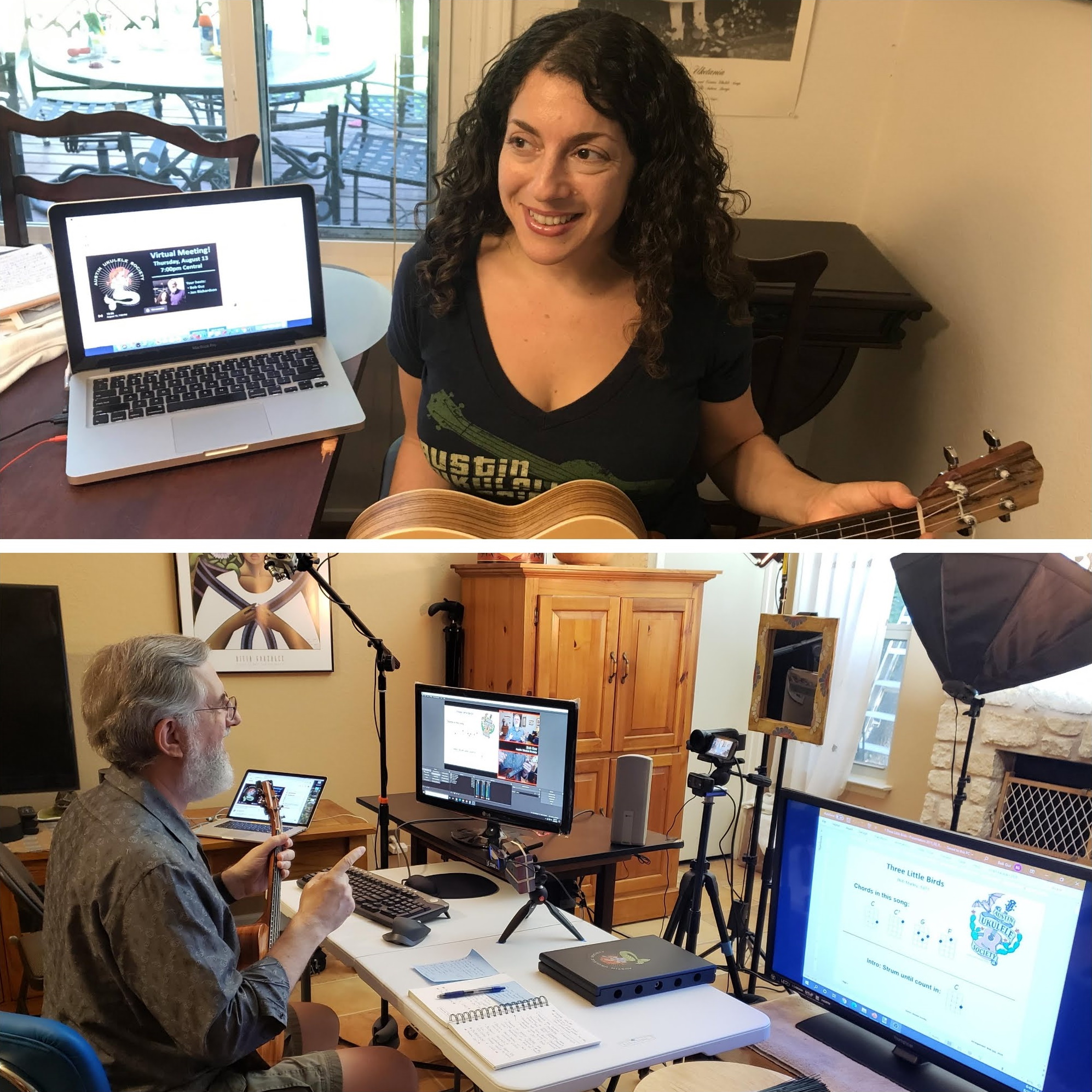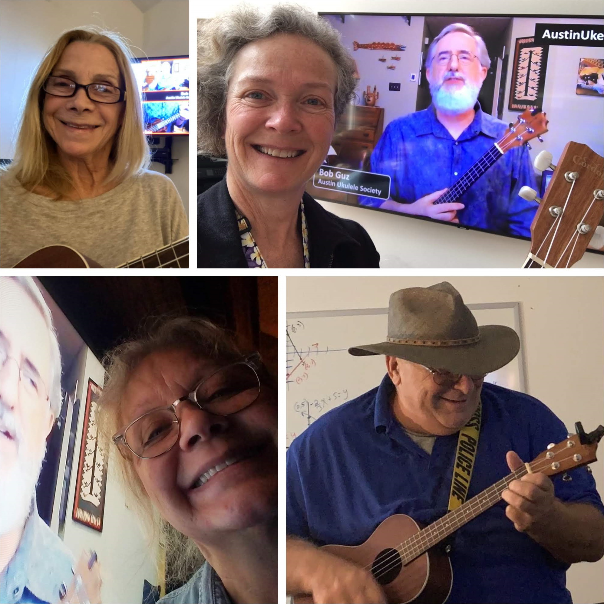 On a mid-August evening, nearly 200 ukulele players on at least four continents (North America, South America, Europe and Australia) met up virtually to play music and sing songs, in pandemic-style togetherness, keeping the ukulele kindred spirit going strong. As the Austin Ukulele Society’s virtual meeting got started, everyone had a great time catching up over the live chat and seeing a cool photo of Bob’s grandpa playing ukulele in 1930. Bob then shared some local ukulele news, including a recap of our recent fundraiser for Kick Butt Coffee, and we launched into our warm up song (Bob Marley’s “Three Little Birds.”)