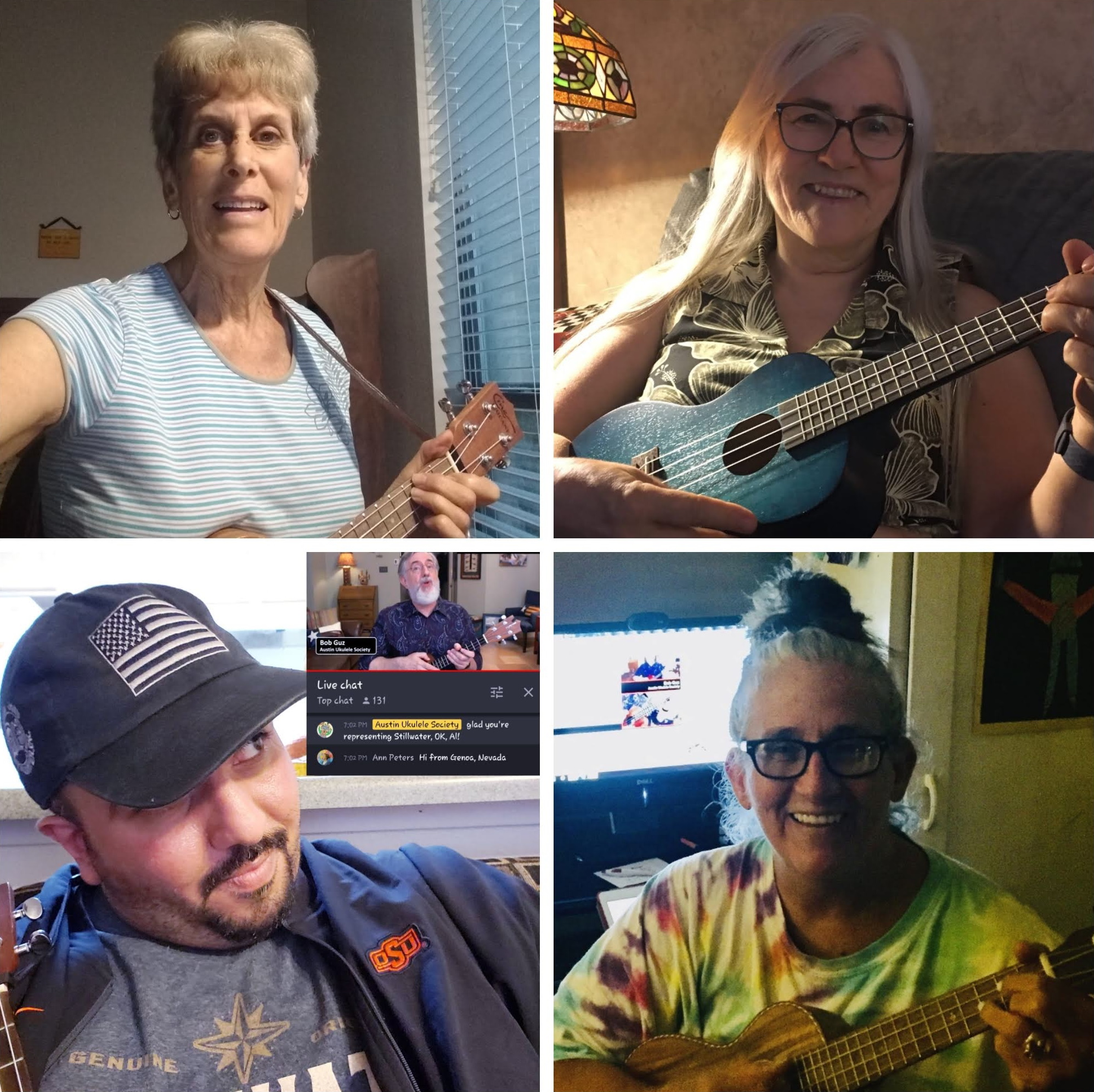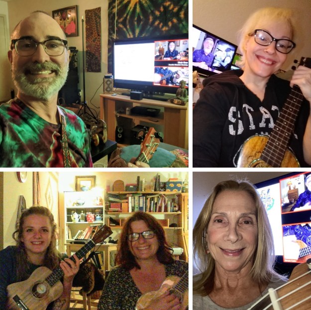 For the Austin Ukulele Society’s September meeting, nearly two hundred ukulele enthusiasts from around the globe met up to sing, strum and pick together virtually. We enjoyed greeting friends from Peru to India, Australia to Canada, Germany to Singapore, and many U.S. states. Bob kicked off the meeting by sharing some ukulele news, including info about the upcoming Lil Rev workshop and concert we’re hosting on Friday, September 25. We warmed up our fingers and voices with Bob Marley’s “Three Little Birds.” Next, Bob demonstrated his terrific arrangement of the classic power-ballad by REO Speedwagon, “Can’t Fight This Feeling.” Bob then took us through the exercises he’d prepared, which helped us learn the strumming style, the picking options, and the chord changes for this huge 1984 hit. When we put the song together and played it through a couple of times, everyone was feeling confident and happy! We closed out the evening by playing Willie Nelson’s “On the Road Again.”