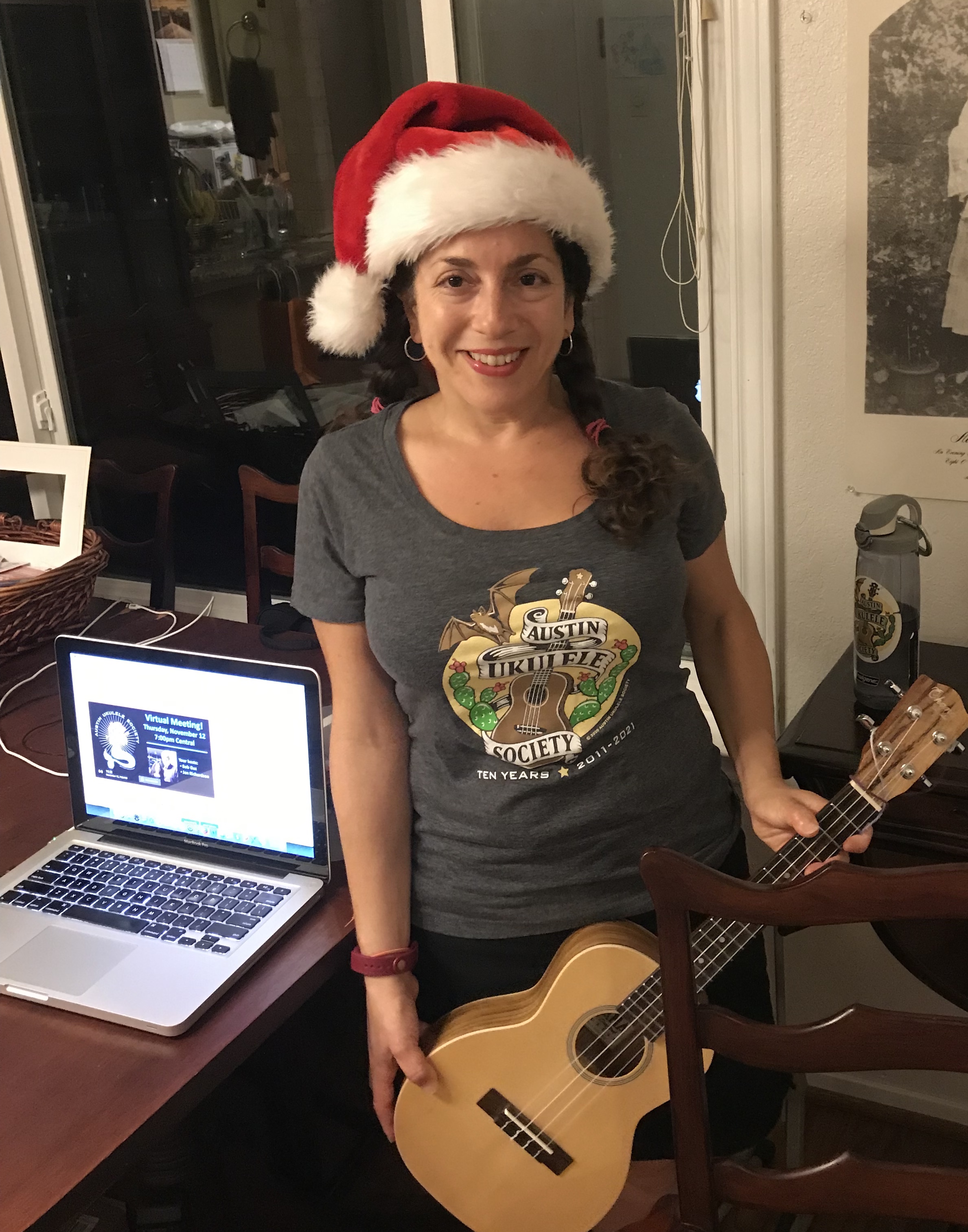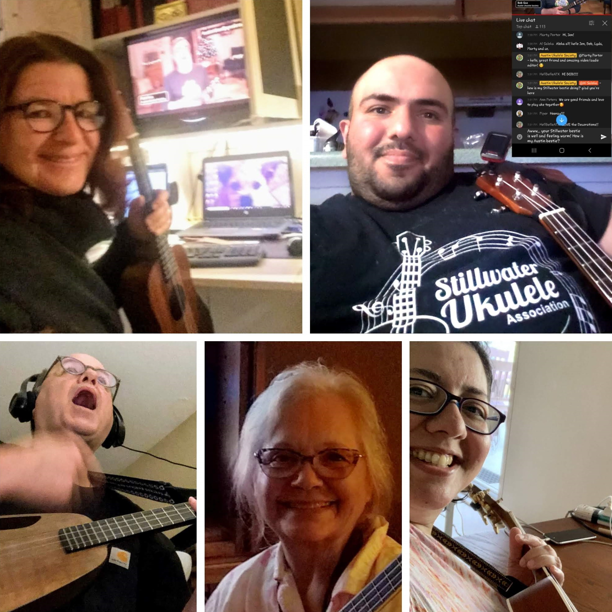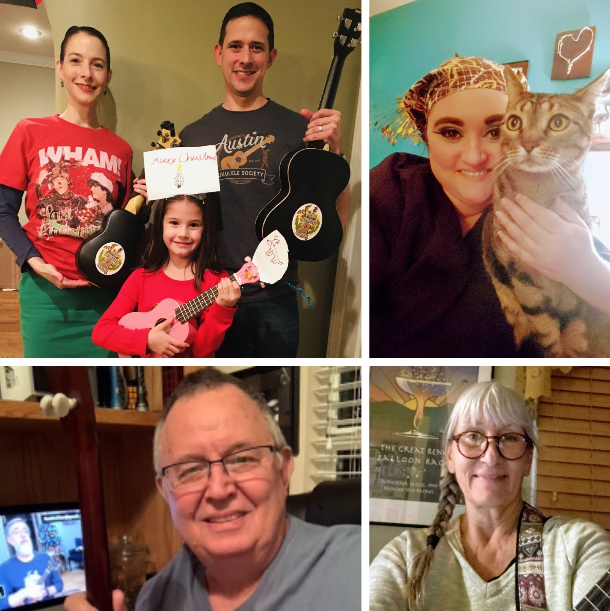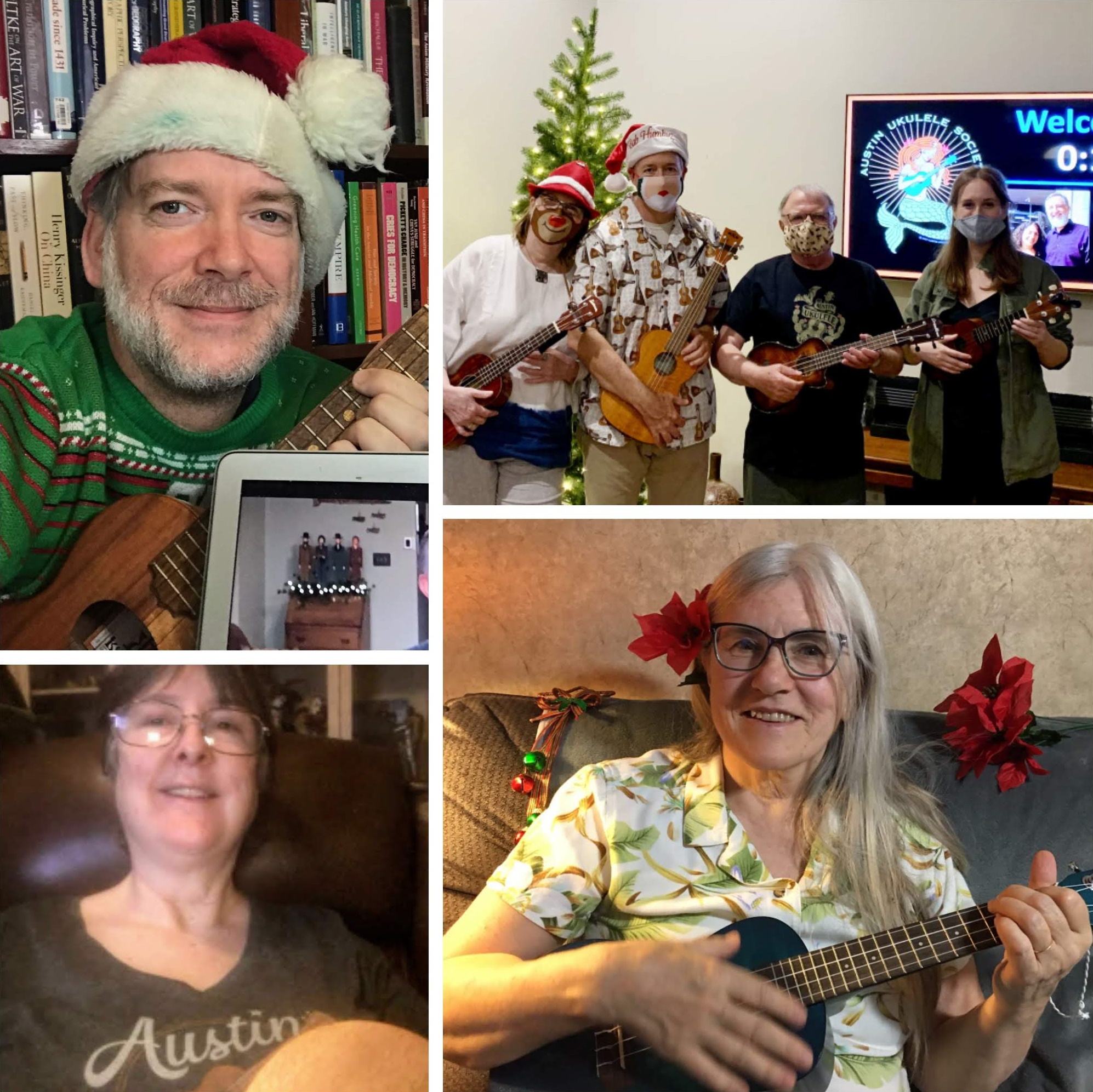Happy November! The Austin Ukulele Society’s members and friends from around the globe had a wonderful time kicking off the holiday season together, at the November 2020 meeting. We began the evening with greetings from uke lovers near and far, from the Philippines to Brazil, Germany to Canada, England to California, areas in and around Austin and, of course, many points across the U.S. Bob shared some news and updates, reminding friends to subscribe to our YouTube channel, enjoy our group videos, consider purchasing our new 10th anniversary t-shirt and to support their local ukulele music groups however they can. We then warmed up our fingers and voices with Bob Marley’s timelessly cheerful “Three Little Birds”.