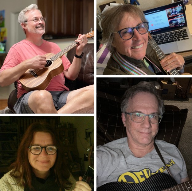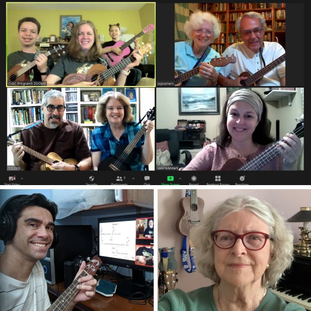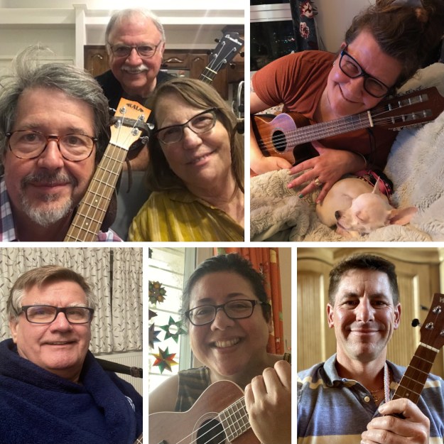 We kicked off our meeting with some ukulele news and updates from Bob, including a “Save the Date” for an upcoming workshop and concert we’re hosting with Lil Rev on Wednesday, May 19. We warmed up our fingers, voices and hearts with Bob Marley’s “Three Little Birds.” Next, Bob performed a lovely demo of his arrangement of Elton John’s “Daniel.” He then took us through helpful exercises on the chords and chord progressions, the strum style and the fingerpicking options. Everyone enjoyed learning this pretty song and seeing what a nice fit it was for the ukulele, especially with Bob’s terrific arranging and teaching. When we played the song through, we all felt good about how much we’d learned and how good we sounded. We closed our meeting with Willie Nelson’s “On the Road Again” and debuted the excellent video collaboration of The Cranberries’ “Dreams,” produced by our friend Marty Porter.