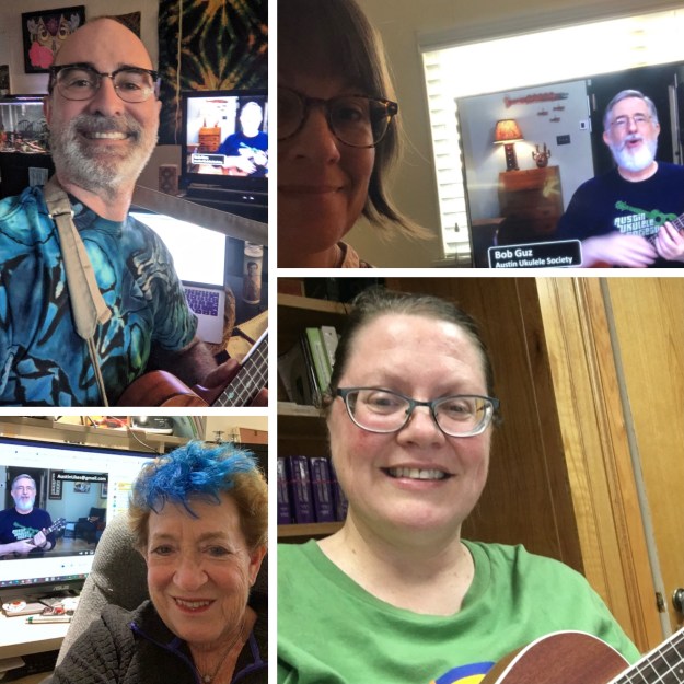 Over 160 ukulele players joined to make music together at the April Austin Ukulele Society online meeting. With participants from Australia, India, Brazil, England, Canada, Germany, the UAE, and many points throughout the U.S. — including Hawaii — we had a diverse gathering of friends who share an affection for our favorite little four-stringed instrument! A big thank you to Jen for moderating the live chat and to Lyda for her amazing projectionist work.