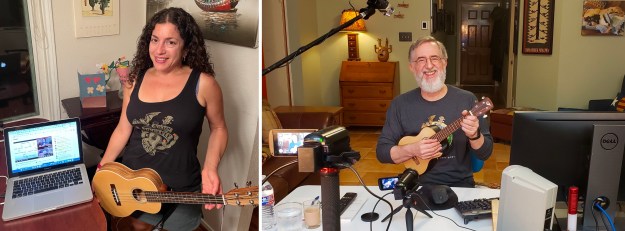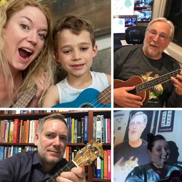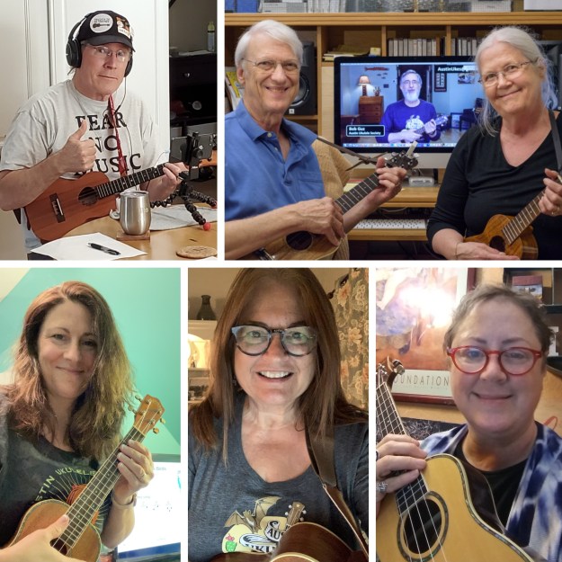 The May meeting of the Austin Ukulele Society was full of good-spirited uke-playing friends from all over the world, including Australia, Singapore, Colombia, Brazil, Ireland, England, Germany, Canada, and coast-to-coast in the U.S. It’s such a pleasure to hear from you, in the chat, via email, with your selfies, and more – thank you for continuing to join us!
