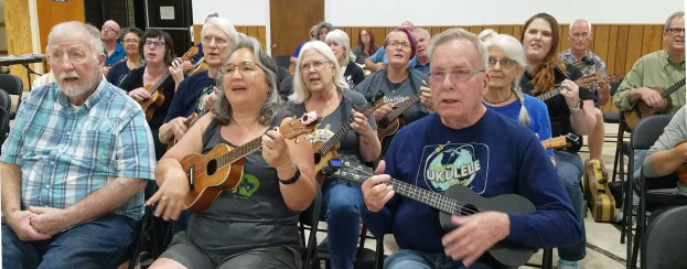 The evening began with local ukulele news, including the happy occasions of the Tuesday Uke Group (TUG) beginning in-person meetings again soon. South Austin Ukulele Community & Events (SAUCE) will also resume in the near future, so keep an eye out for more info there, too! After introductions and news were shared, Bob led us through our ever-cheerful warm-up song, Bob Marley’s “Three Little Birds.”