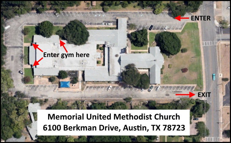Memorial United Methodist Church, 6100 Berkman Drive, Austin, TX 78723. We meet in the school located behind the church, in the gym.