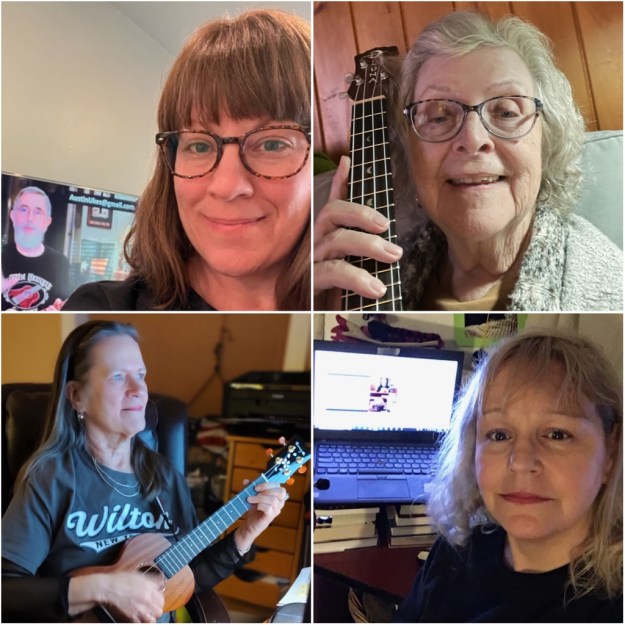 Bob kicked us off with ukulele news and our warm-up song, Bob Marley’s “Three Little Birds.” Then he performed his terrific arrangement of “Can’t Help Falling In Love.” Bob led us through helpful exercises to teach us the chords, chord progressions, strum pattern, and picking options. He also introduced some vocal harmonizing options. We really enjoyed learning the song, part by part, and putting it all together to play through a few times. Before we said good night, we played our swan song, Willie Nelson’s “On the Road Again. Afterward, we continued to chat and watch some of the Austin Ukulele Society’s wonderful videos, including collaborative ones produced by Marty Porter and Paul Butler.
