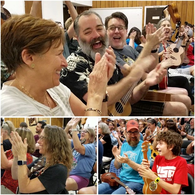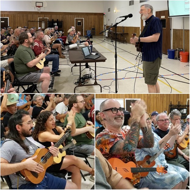 The August in-person meeting of the Austin Ukulele Society was truly a supernatural delight, and a fine and natural sight! To get the evening started, over 130 ukulele players from all walks of life introduced themselves. Everybody there was outta sight! Then Bob led us through our warm up song – Bob Marley’s “Three Little Birds.”