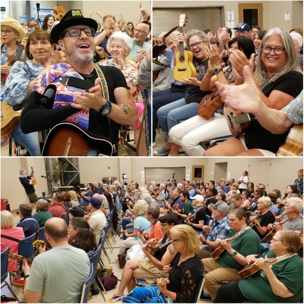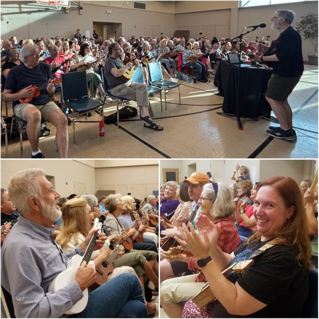 Bob kicked off the meeting with lots of exciting local ukulele news and a brief description of the evening’s flow. We then warmed up our fingers and voices with Bob Marley’s “Three Little Birds.”