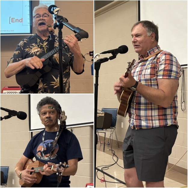 Bob gave us a great performance of his arrangement of Michael Jackson’s “Thriller” before we launched into helpful exercises. We practiced chord progressions, strumming options, and even an appropriately-timed stomp as we learned to strum and sing.