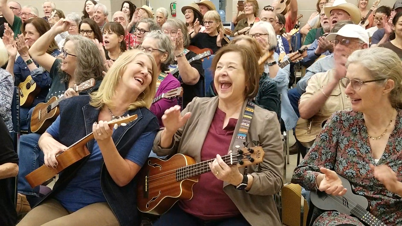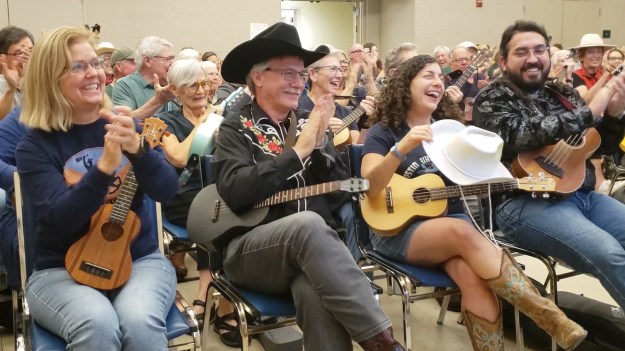 For the monthly meetings, our friend Lori brings loaner ukuleles, donated by the TUG (Tuesday Ukulele Group)! They are Makala concert and soprano ukes, and you can borrow one to play during the meeting. You’ll find them at the front of the room; so if you don’t have a uke yet, or you forget your uke at home, or your uke is in disrepair, please join us and borrow a TUG loaner uke. 🙂
