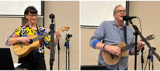Bob kicked off the meeting with introductions and a quick review of the agenda. After sharing some local ukulele news, Bob (with support from Jay on U-bass) gave us a lovely performance of “Take a Chance on Me.”