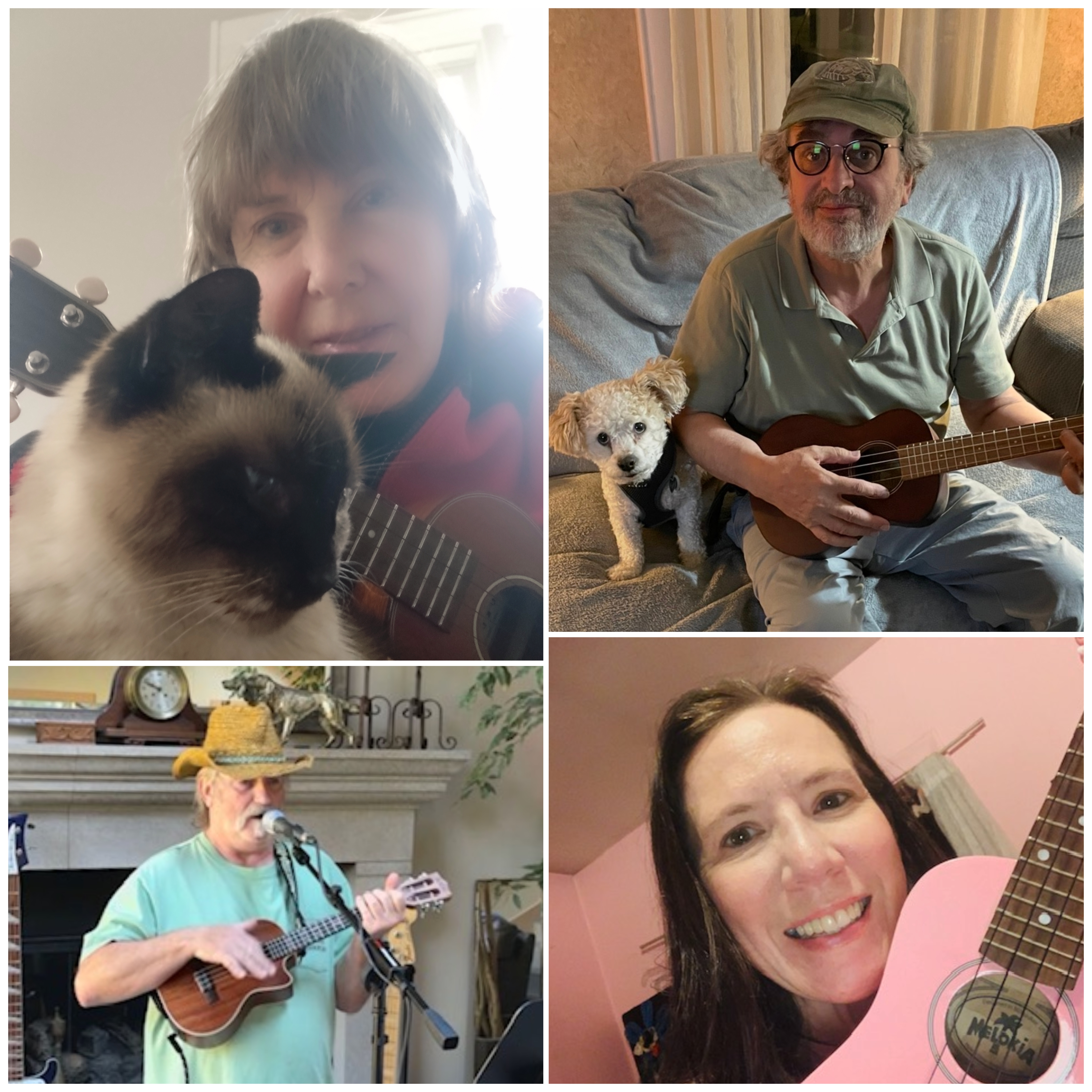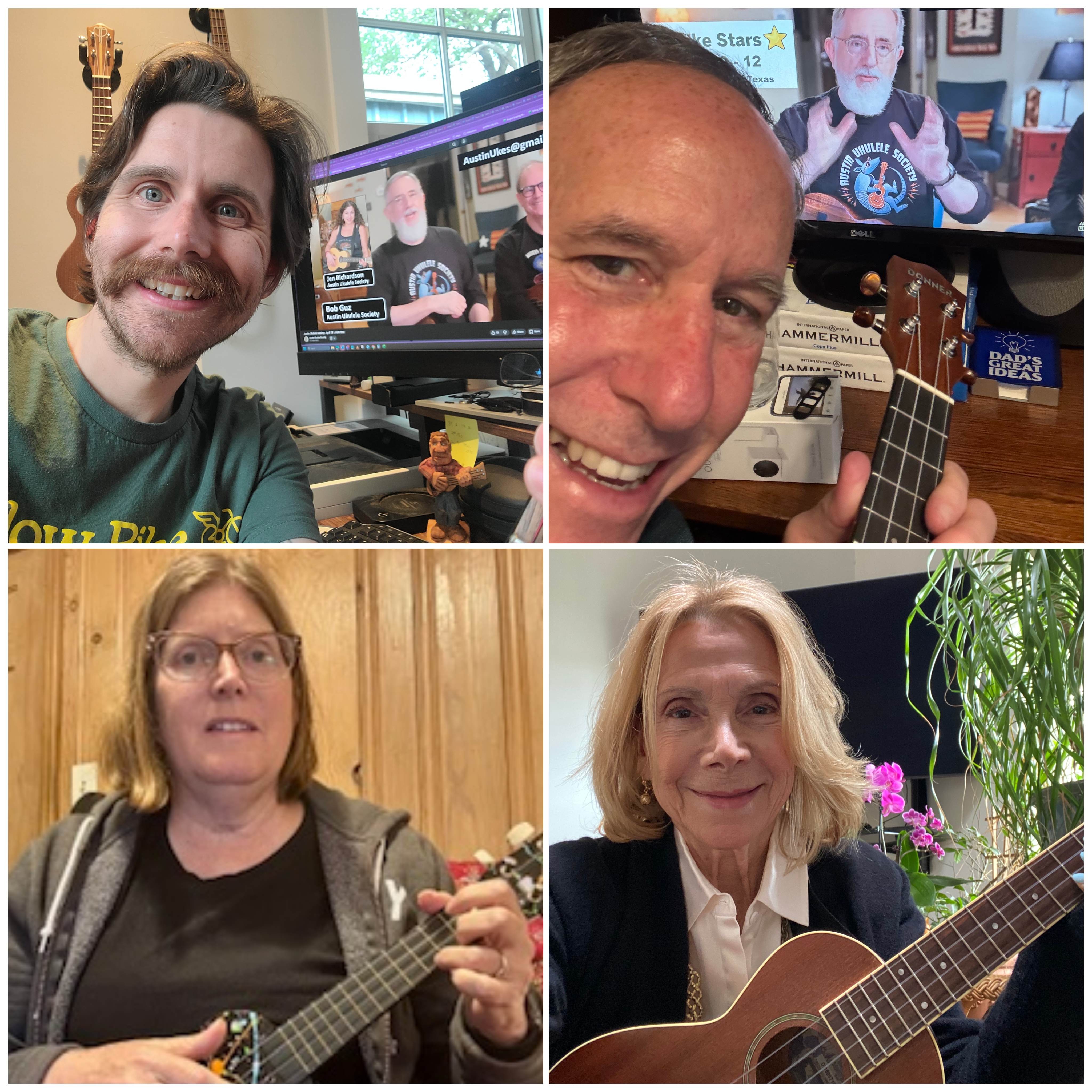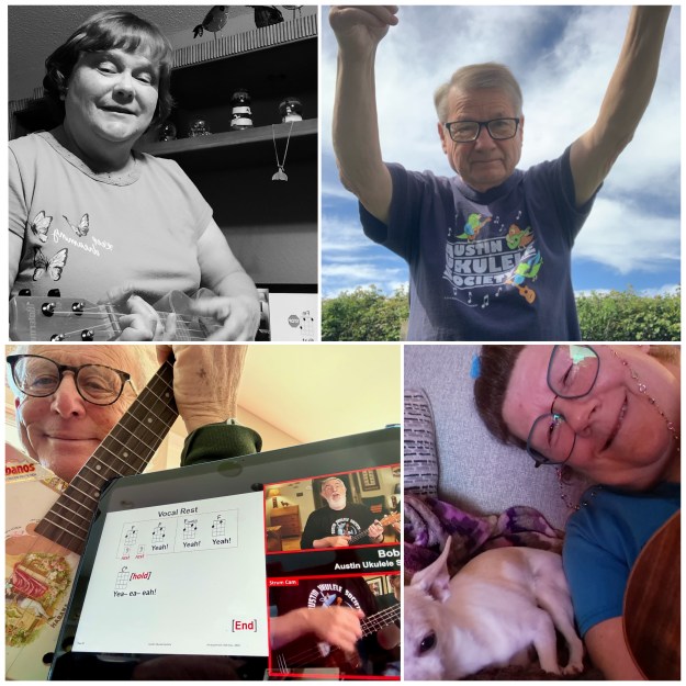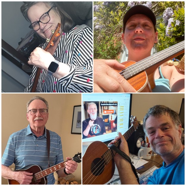 Bob kicked off the meeting by sharing some local information, including the July 9th – 12th Uke Stars event. You can sign up to get details from our friends at Groundwork Music Project.Β He also introduced our good friend Jay Clement, who joined him at his home, to play U-bass and sing harmonies.