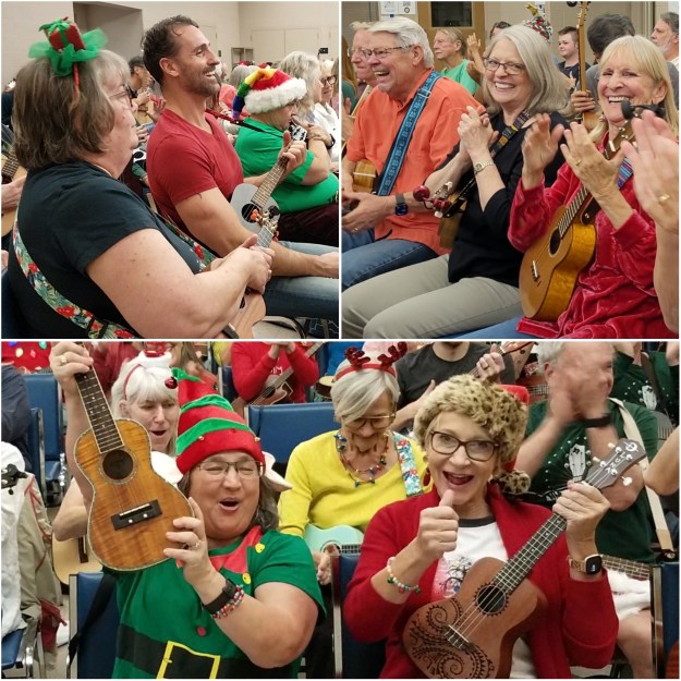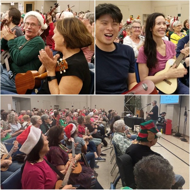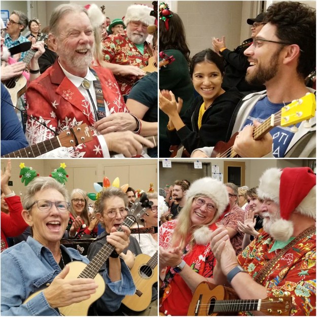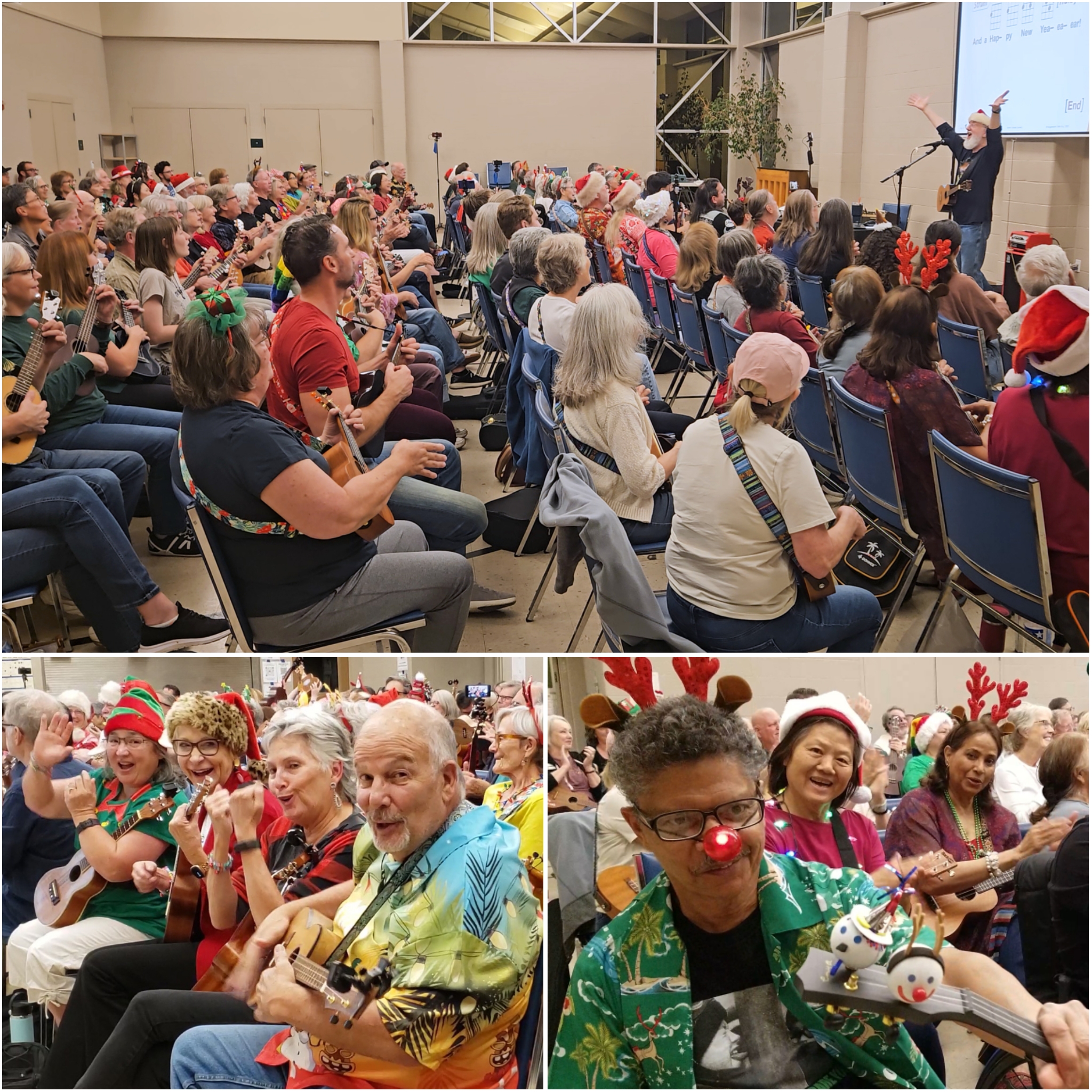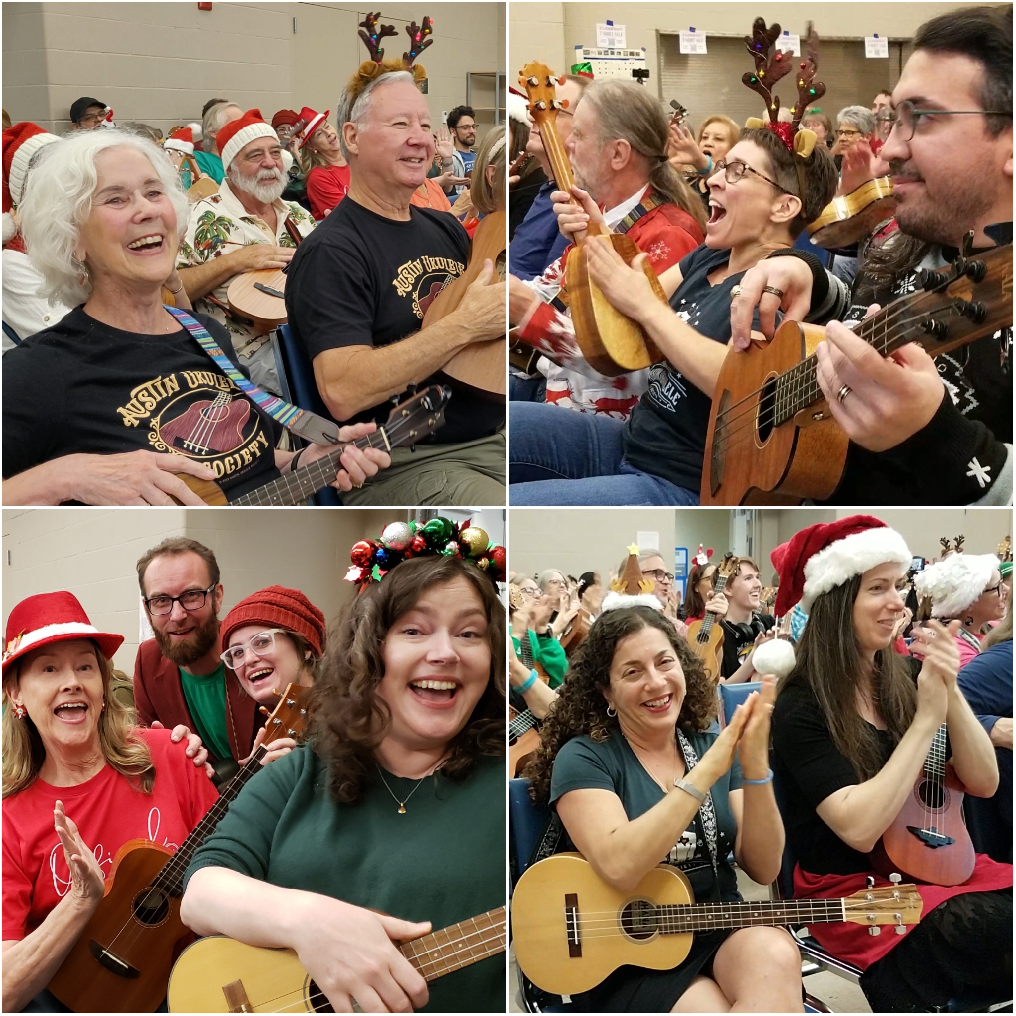On a balmy December evening in Austin, around 150 ukulele players brought lots of cheer and merriment with them to our 15th Annual Holiday Potluck and Strum-along! 🎁 🎄