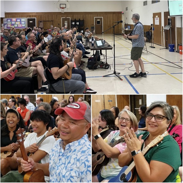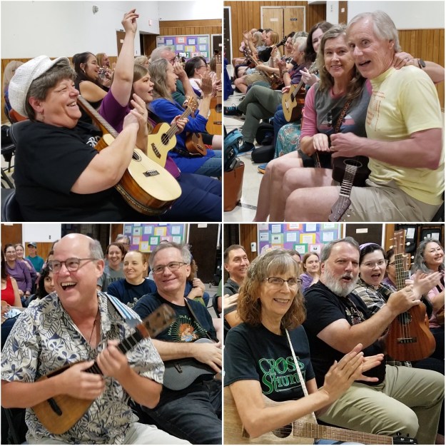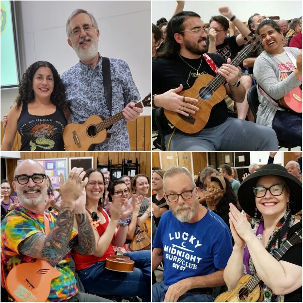 On a springlike February evening, around 100 members of the Austin Ukulele Society met up to sing and strum. We enjoyed some social time, introductions and sharing local ukulele news, before we jumped into doing what we do best: making music together, with our terrific maestro, Bob! First, we warmed up by playing Bob Marley’s “Three Little Birds.”