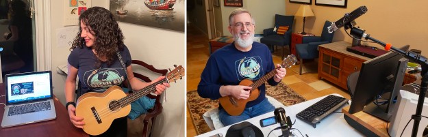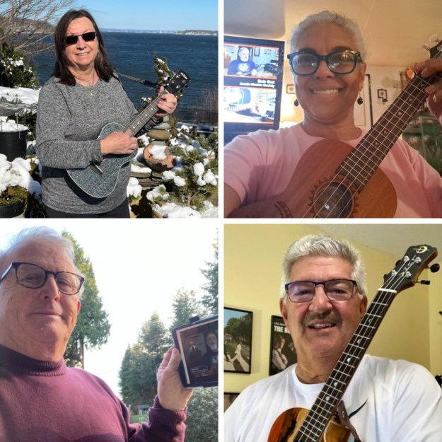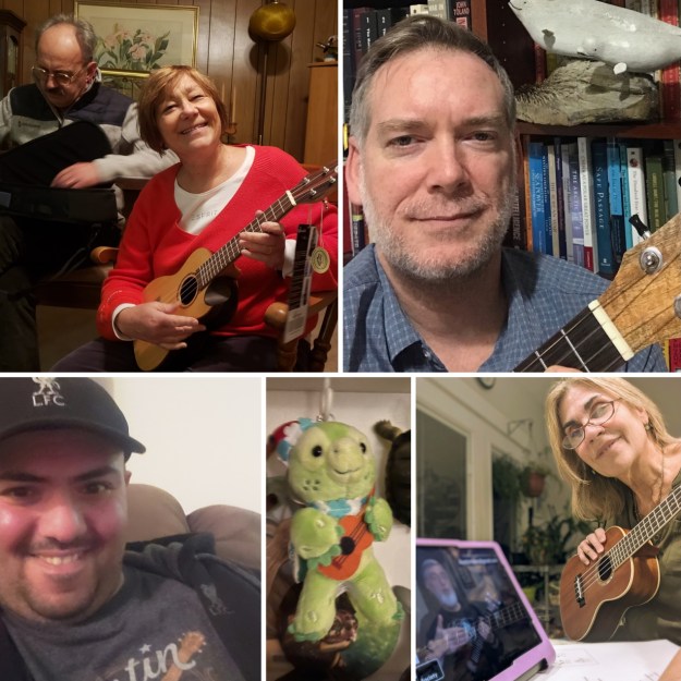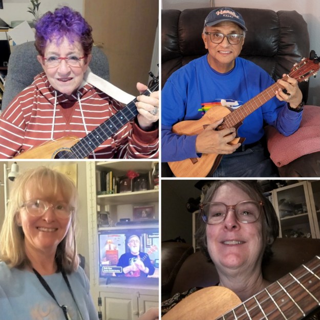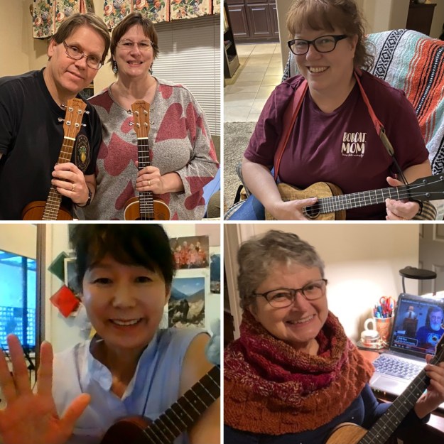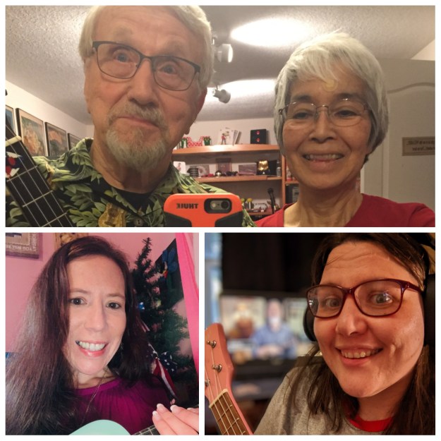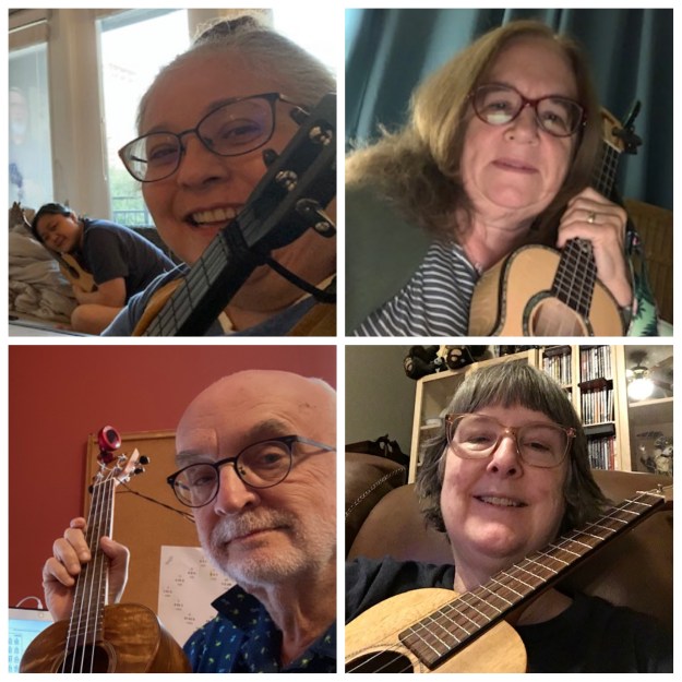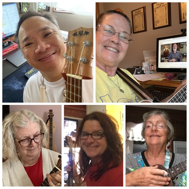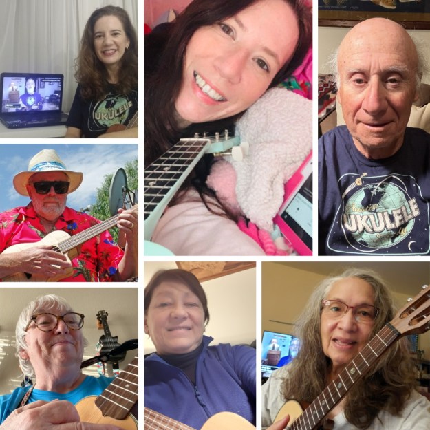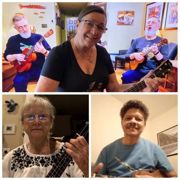 Our evening started out, as usual, with introductions and local ukulele news. Then Bob took us through our warm-up song, Bob Marley’s “Three Little Birds.”