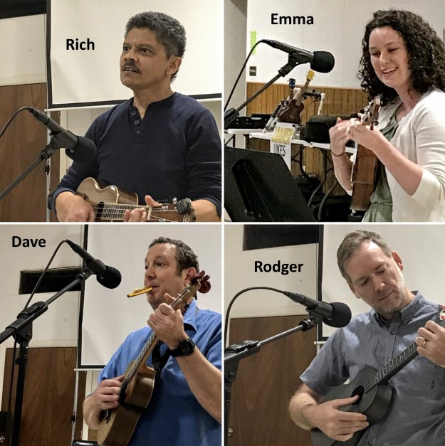 The September Austin Ukulele Society meeting got off to a wonderful start with a visit from our friend Jacob Borshard who brought beautiful silk-screened posters and shared info about the upcoming Voyage to Uketania X: Uku-Beatle-ele-lele show Thursday, September 26, at the Sahara Lounge. After some introductions and additional ukulele news, we warmed up our fingers and voices with Bob Marley’s “Three Little Birds.”