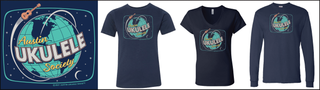 The shirts are silk screened here in Austin at a fantastic locally-owned print shop and are available for purchase at our meeting. The new “AUS Classic Ukulele” design, “Ukulele Around the World,” “10th Anniversary,” Mermaid, Cowboy,” “Austin Lasso” and other shirts are $20. We also have vinyl decals with the AUS logo for $1 each. We can accept cash or a check made out to Austin Ukulele Society; you can also make payment via Venmo or PayPal.
