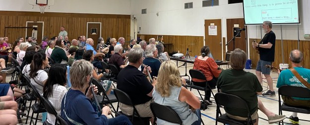 Newcomers and beginners are ALWAYS welcome! Even if you’re a complete novice, we encourage you to come out. Many beginners come to the meetings, and it’s so great to see their skills grow over time! There are almost always easier ways to play the songs, even if you can play only a few of the chords. Or just sing along!