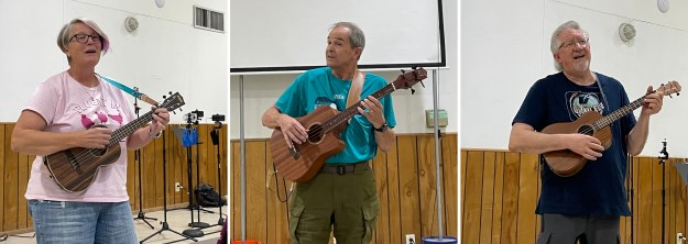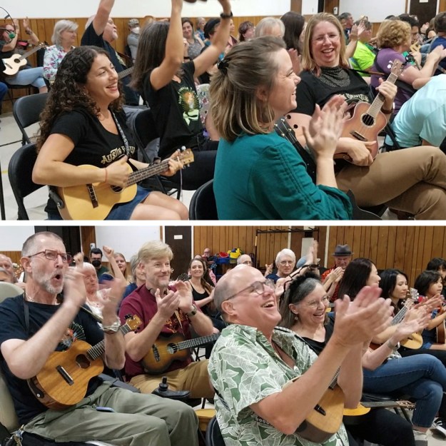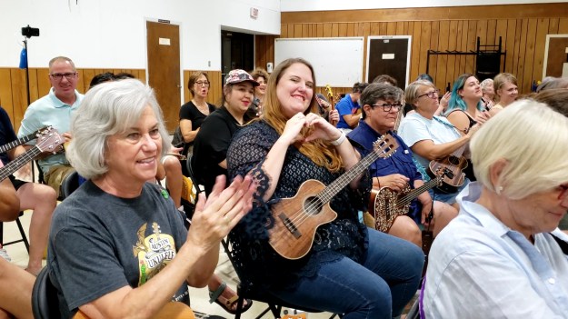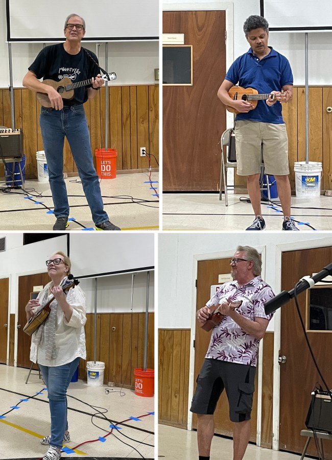For those attending for the first time, the church is easy to find – but it is big. You’ll enter from Berkman Dr. using a ‘one way’ entrance and you can park anywhere alongside or behind the church. Past the canopied main entrance, on the same side of the building, there is another entrance on the right. Walk in there and you’ll be in the gym. From there simply follow the sounds of ukuleles tuning up. 🙂