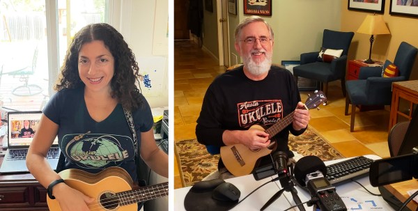 Bob will teach us a medley of two holiday standards, which you likely are very familiar with: “Blue Christmas” and “White Christmas.” There are even a couple of snippets borrowed from two other classics, as you’ll see in the song sheet. The two most famous versions of these songs — Elvis Presley’s 1957 recording of “Blue Christmas” and Bing Crosby’s 1942 recording of “Blue Christmas” — are in the keys of E and A respectively. Neither song is very uke-friendly in these keys, so using Bob’s terrific arrangement, we’ll start with “Blue Christmas” in F, then smoothly modulate to C for “White Christmas.”