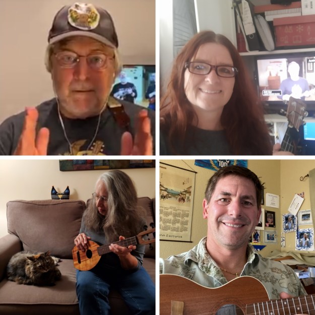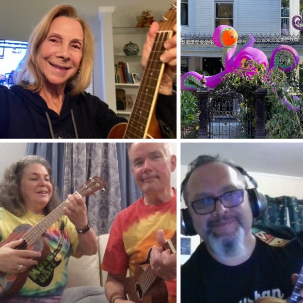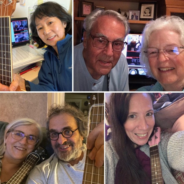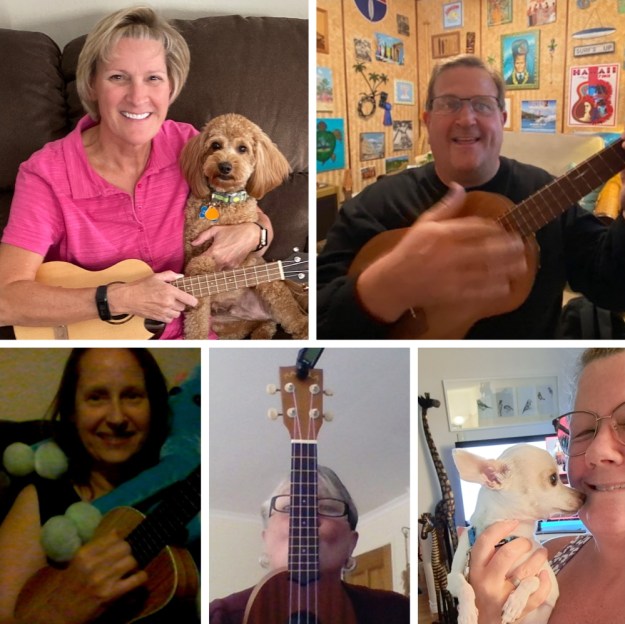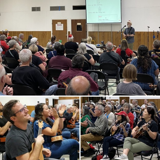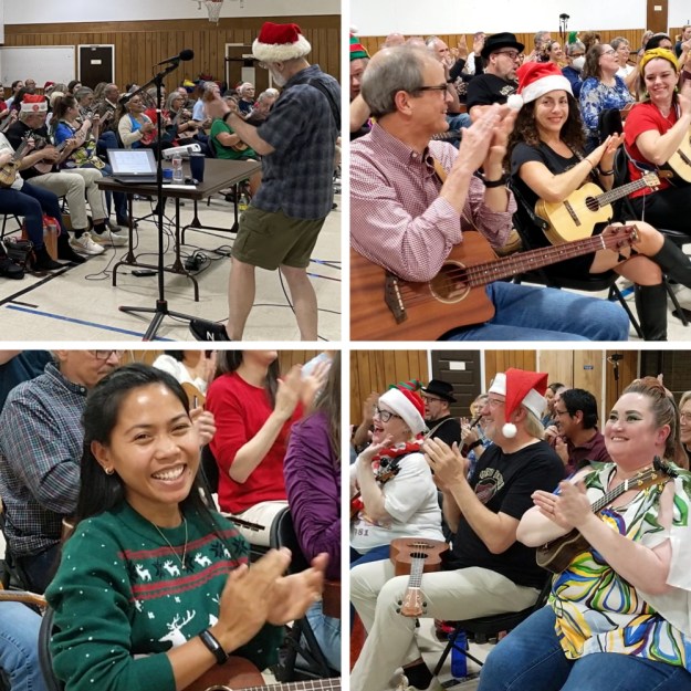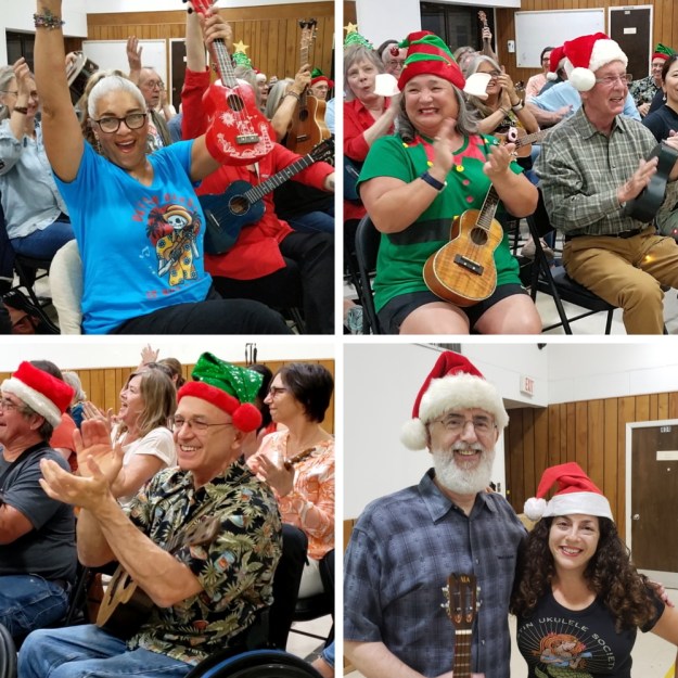 It’s not too early to start building your holiday repertoire! We typically learn a winter holiday/Christmas song in November, so that we have our meeting’s recording to share with our global uke community by late November. Even though we are meeting in very early November this year, we’re ready to get the holiday spirit going and hope you will do so with us, too! Break out your reindeer antlers or elf ears, Christmas sweaters and Santa hats to have an even more festive time!